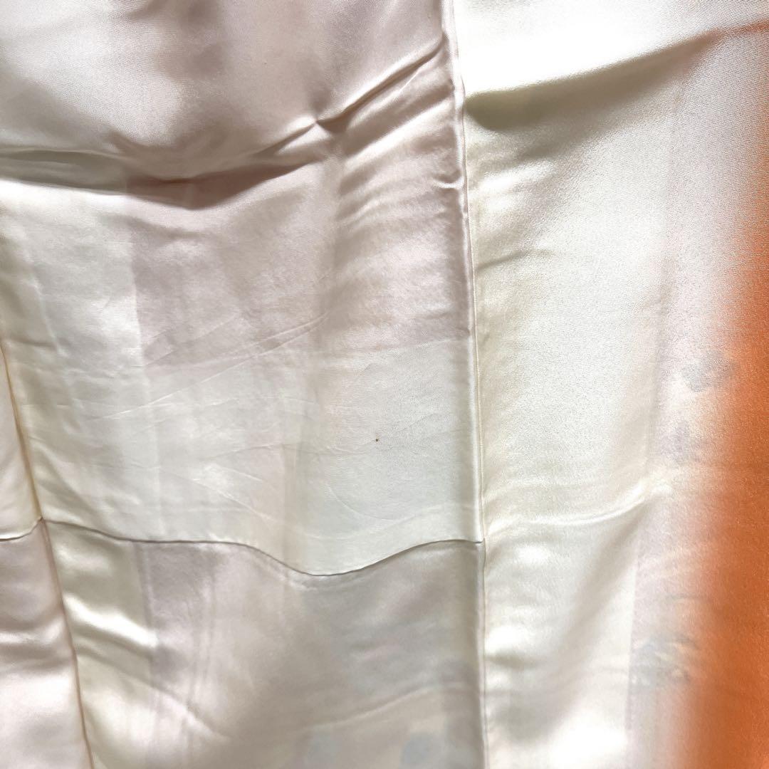 柔らかなオレンジの地に束熨斗に松竹梅に菊花や楓、蜀江紋や亀甲、蛇籠や家屋が描かれた華やかなデザインの上質な加工で仕立てられた一着になります。
