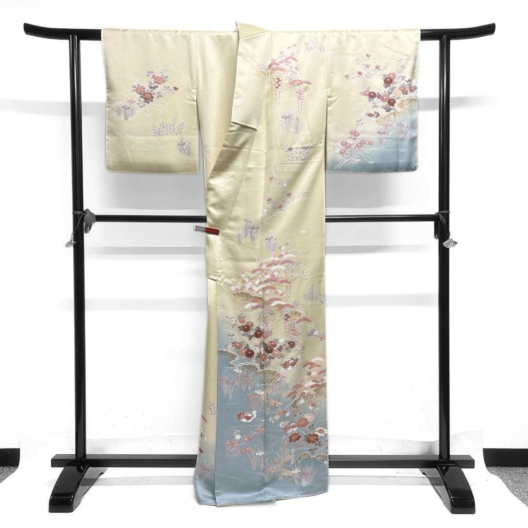 紗綾形地紋の淡く薄いイエローの地に刺繍と金彩を交えて描かれた鴛鴦に流水と様々な花模様が華やかなデザインの一着です。