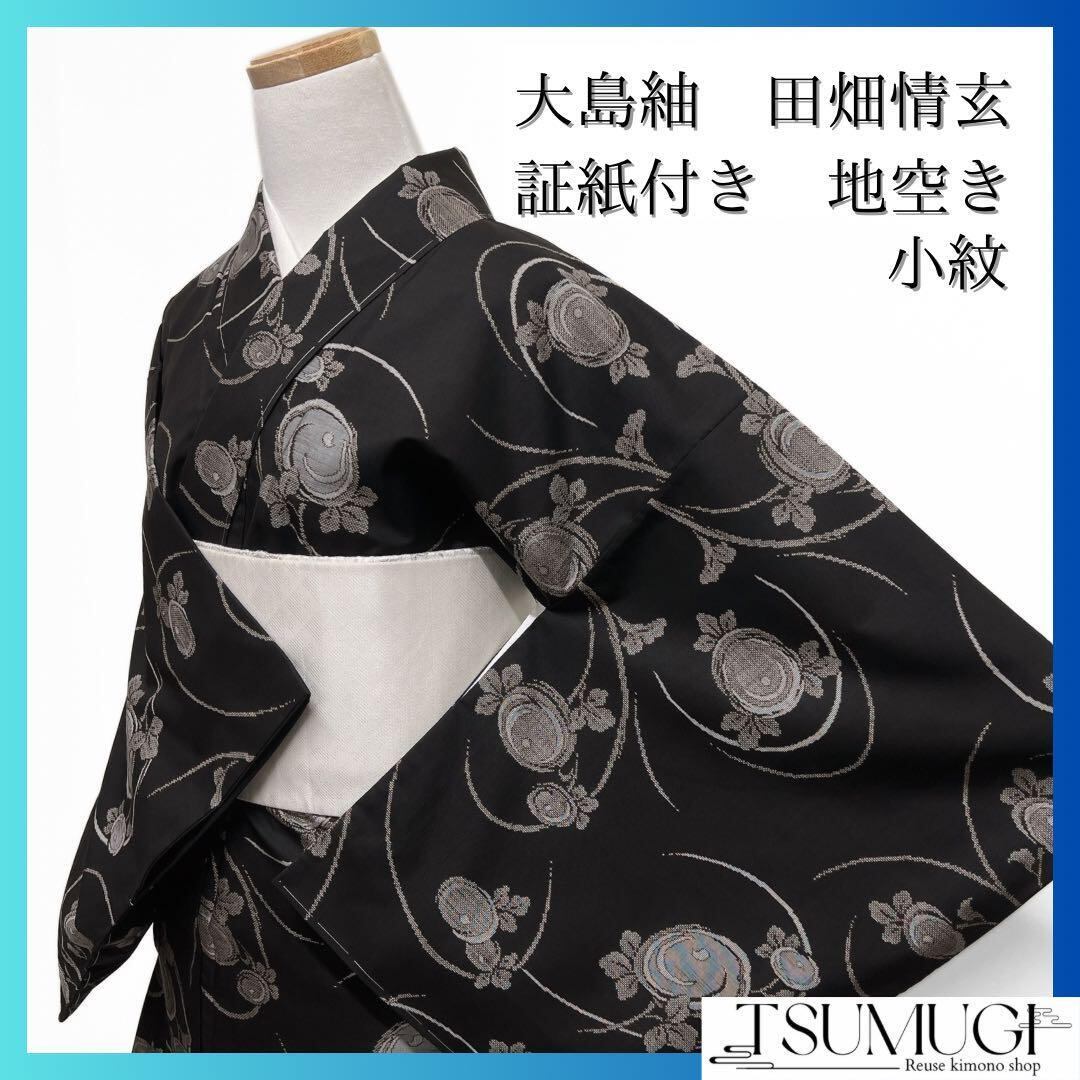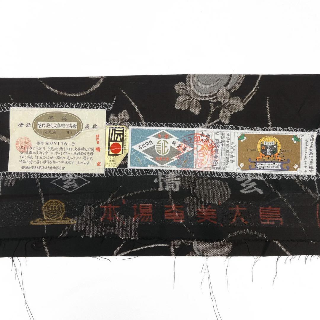 純泥染の大島紬地に地空きの手織りで織られた流線と菊花の文様がお洒落なデザインの一着です。