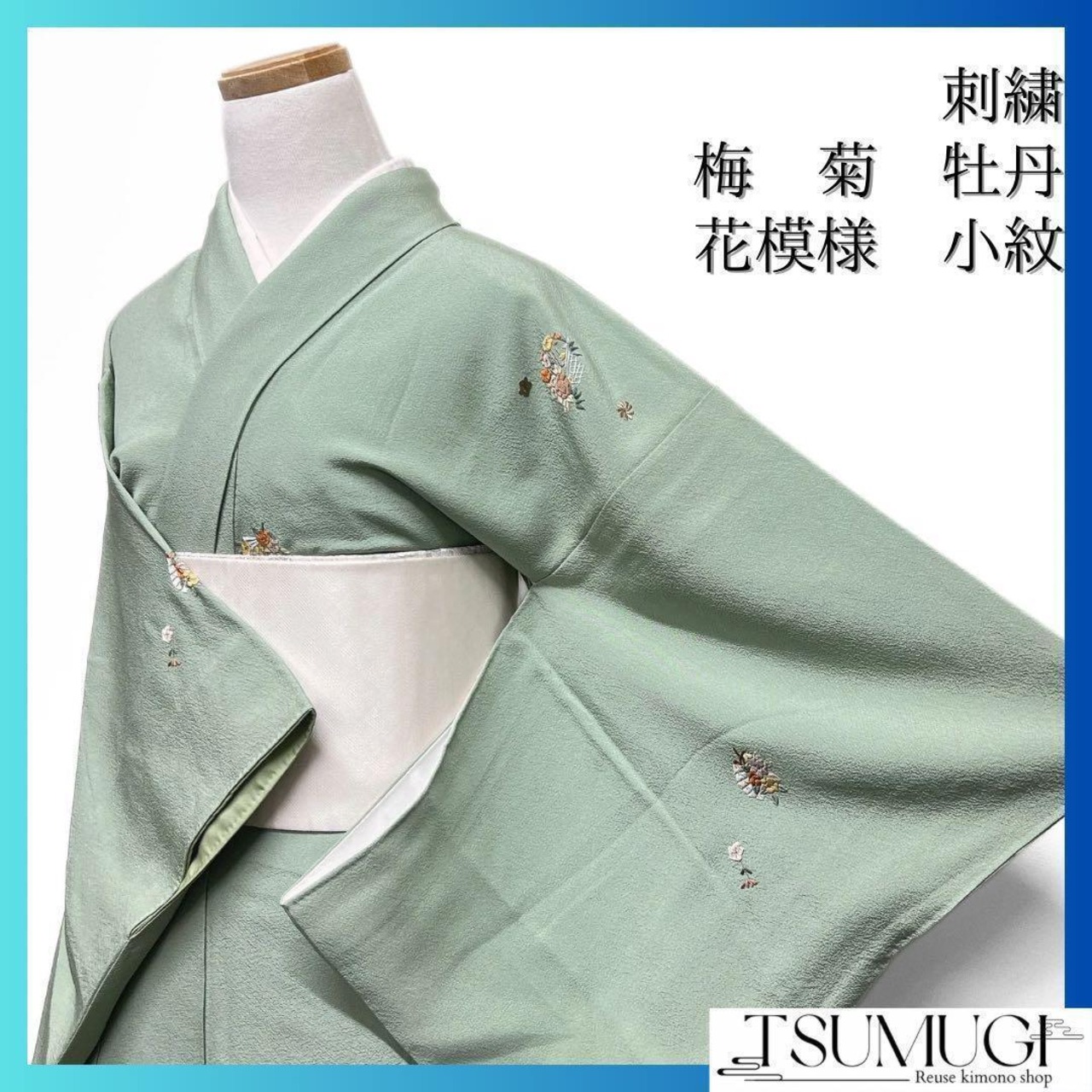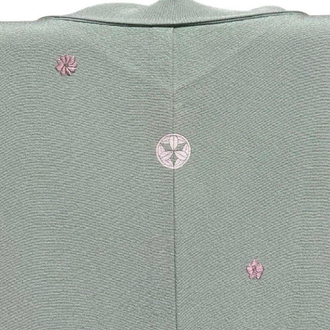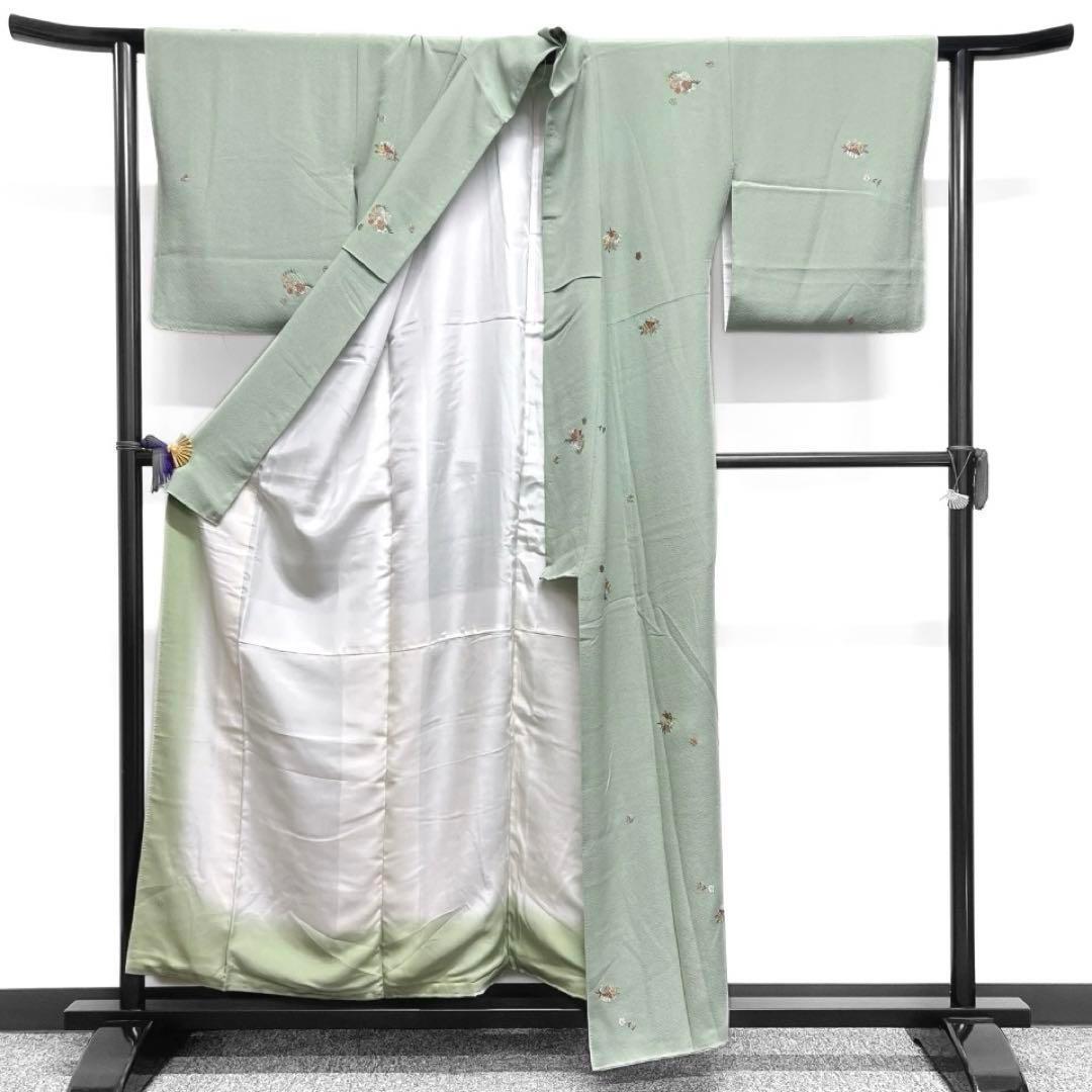 くすみのある薄い緑の地に刺繍で織られた菊や牡丹、梅が織られたお洒落な一着です。