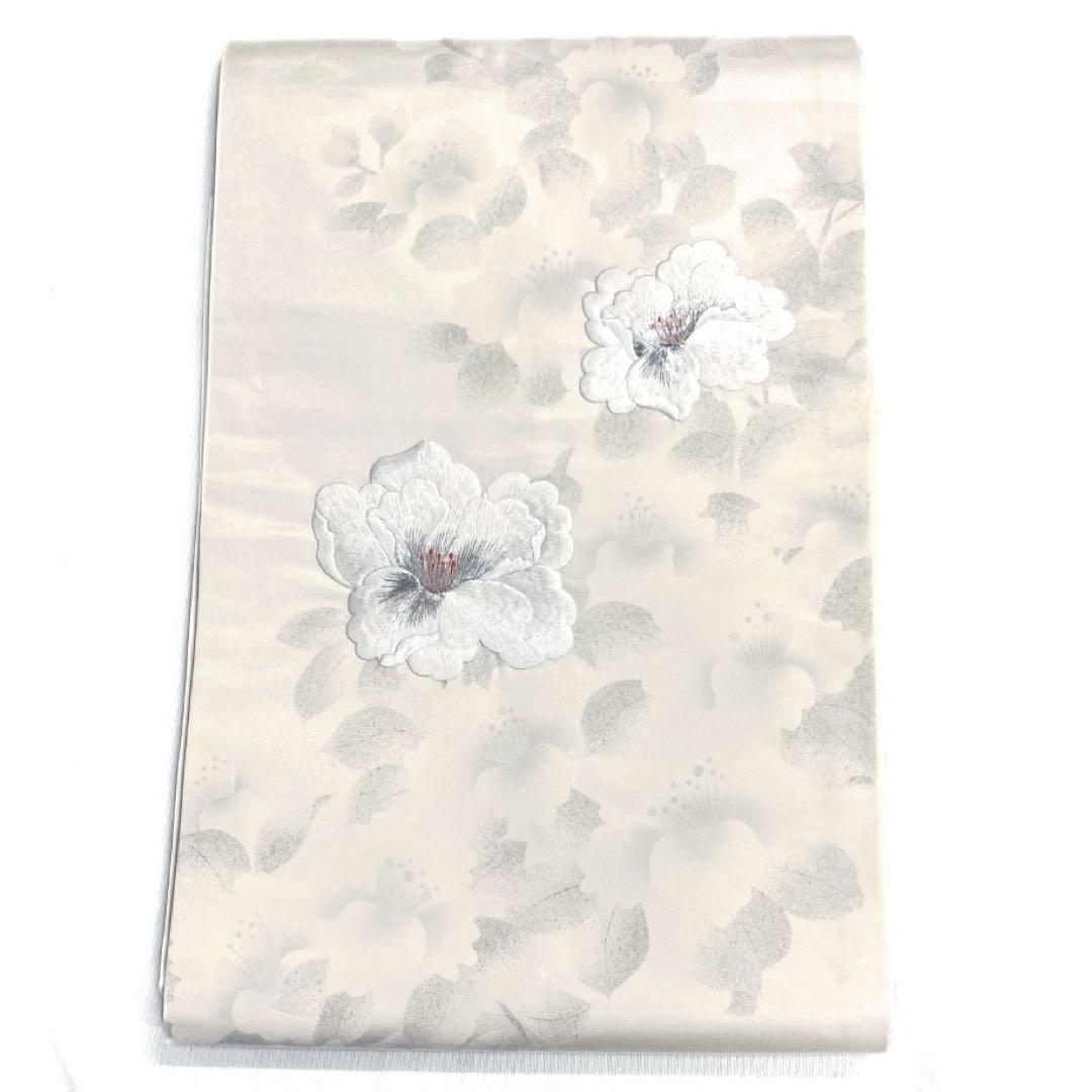 オフホワイトの地に銀糸を交えた刺繍で細やかに織られた八重桜の文様が華やかなデザインの一着です。