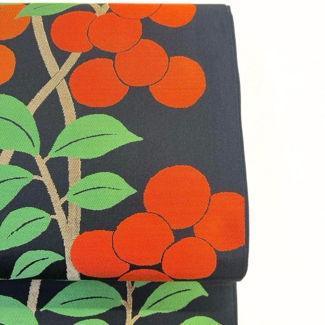黒地に南天模様のような木の実が織り出された袋帯です。