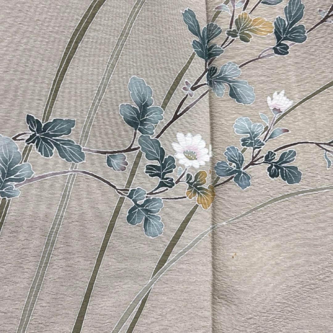 くすみベージュの地に映える友禅染で描かれた菊とリーフの文様が華やかなデザインの一着です。