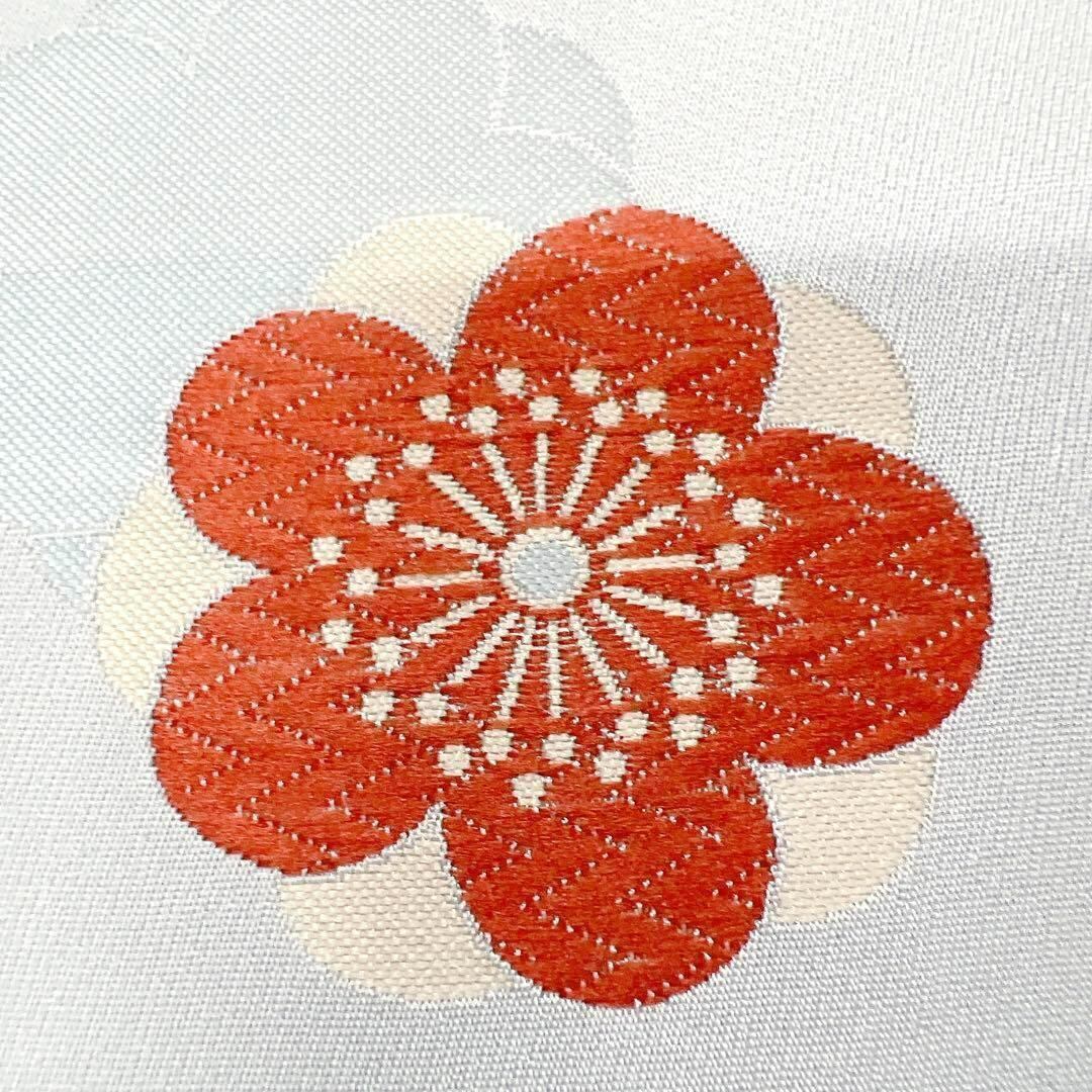 カラフルな梅の袋帯です。肉厚な生地の青磁色に色とりどりの大小の梅の花模様が可愛らしいお洒落な一本となっております。