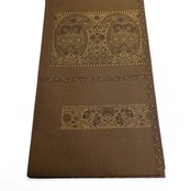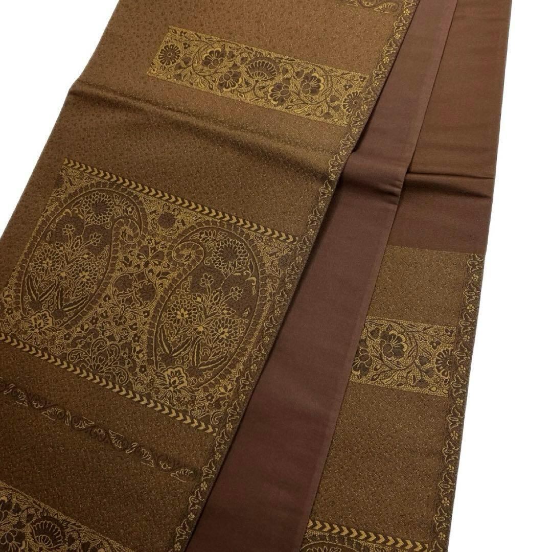 ブラウンの地にくすみイエローで唐花に唐草や横縞の文様が織られたお洒落なデザインの一着です。