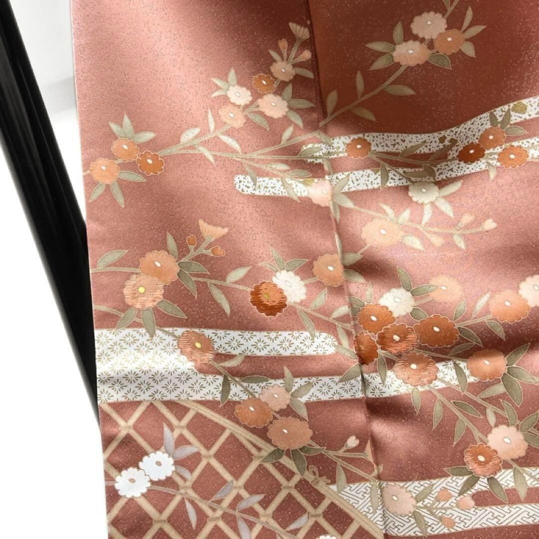 カロットカラーの色味に映える刺繍を交えた菊とヱ霞に蛇籠が描かれた華やかなデザインの一着です。