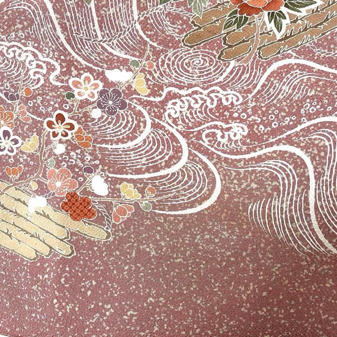 深いくすみのピンクのたたき染地に流水に菊や牡丹、椿、梅花に桜の文様が鮮やかに描かれた華やかなデザインの一着です。