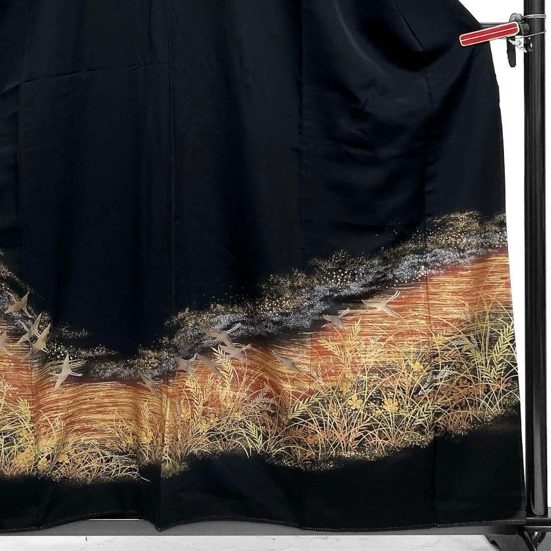 黒地に映える金彩と銀彩を交えて描かれた鶴の文様にリーフと花模様が描かれた華やかで絢爛なデザインの一着です。