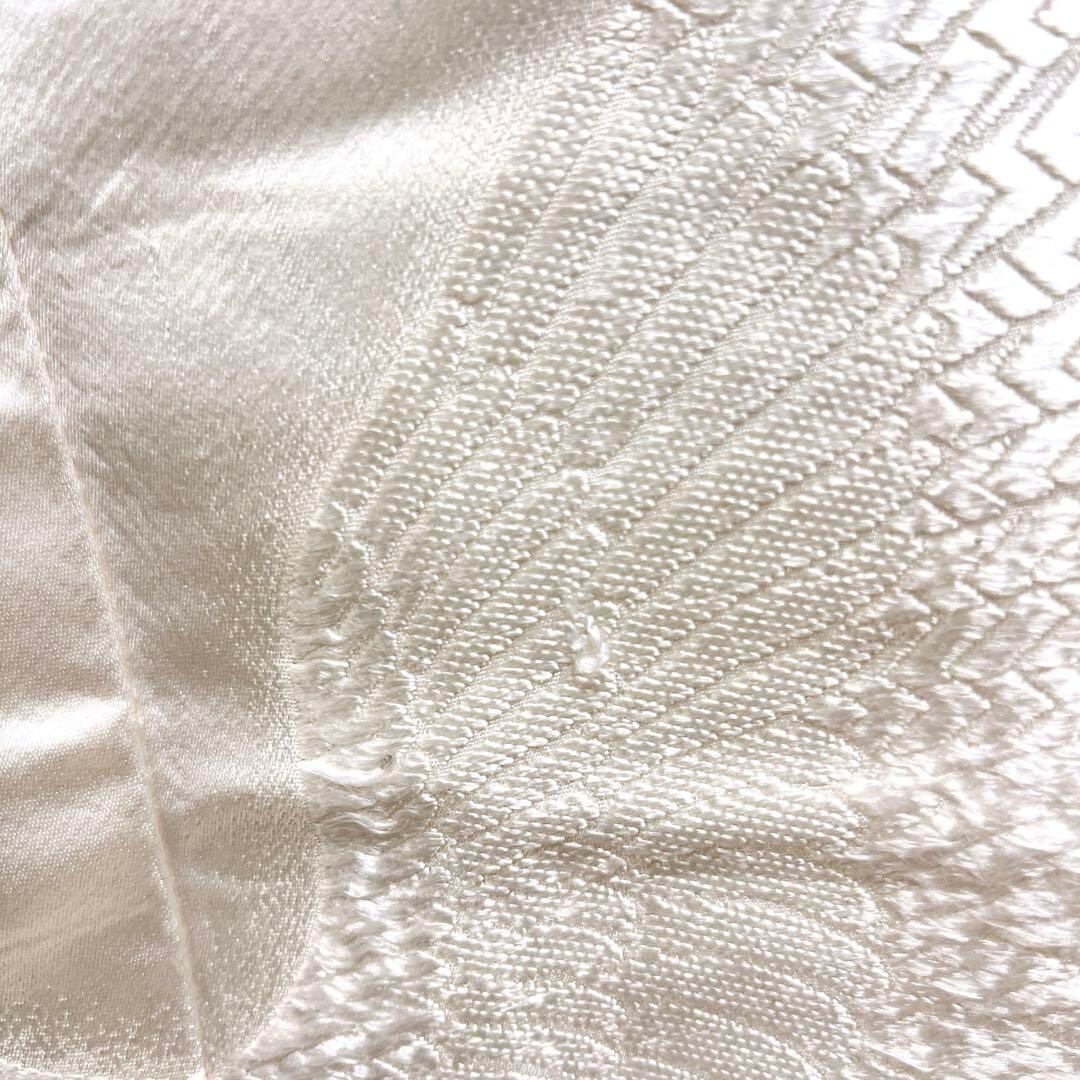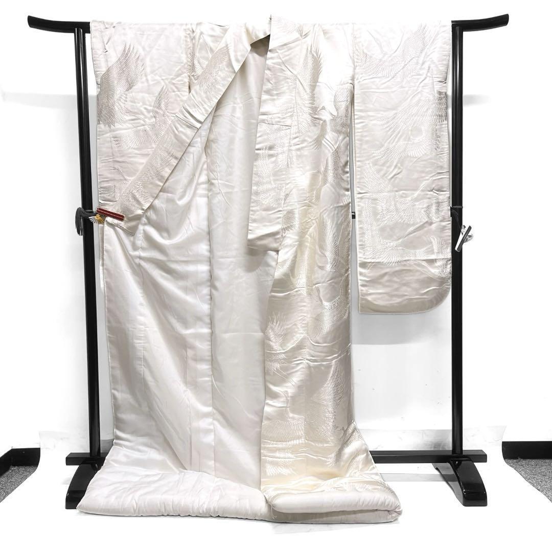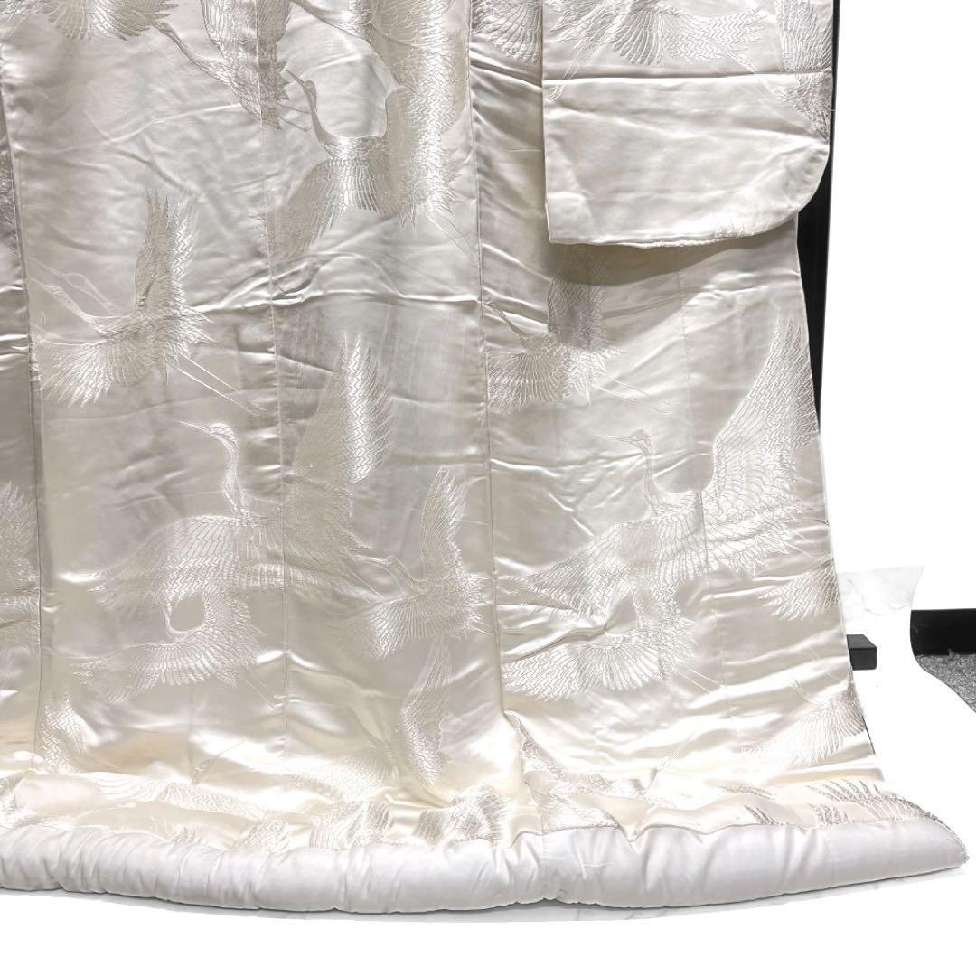 純白の地に唐織で細やかに織られた華やかな鶴の文様が上品で絢爛なデザインの一着です。