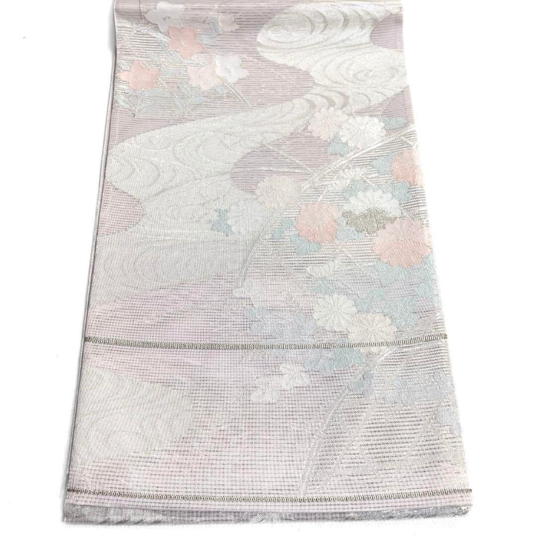 薄く淡いパープルの絽の地に蛇籠に菊や萩、桔梗の文様と流水に観世水の文様が織られた涼しげで華やかなデザインの一着です。