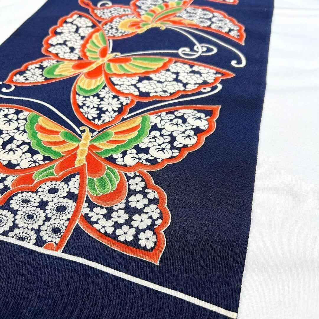 藍色の縮緬地に蝶模様が描かれた帯の反物です。