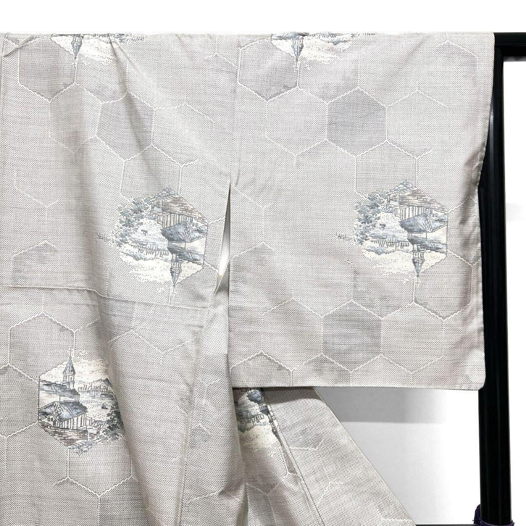 白大島紬の爽やかなお色味に亀甲や街並みが細やかに織り出された1着です。