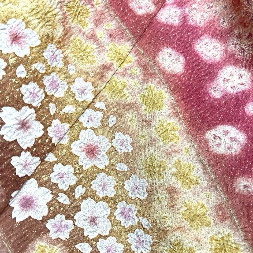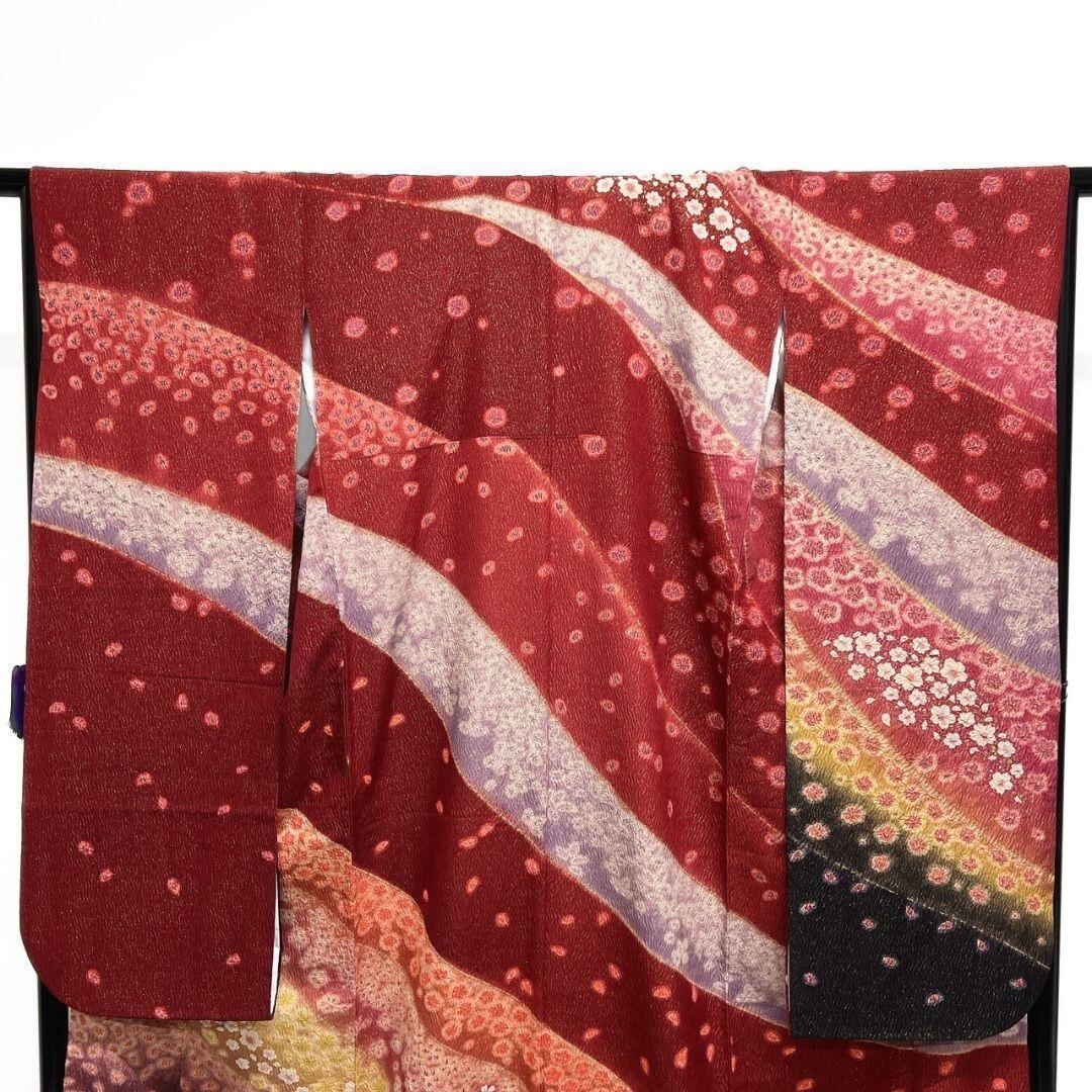 流れる様に描かれた流線のグラデーションに桜花 ドットや梅花が細やかに描かれた一着です。