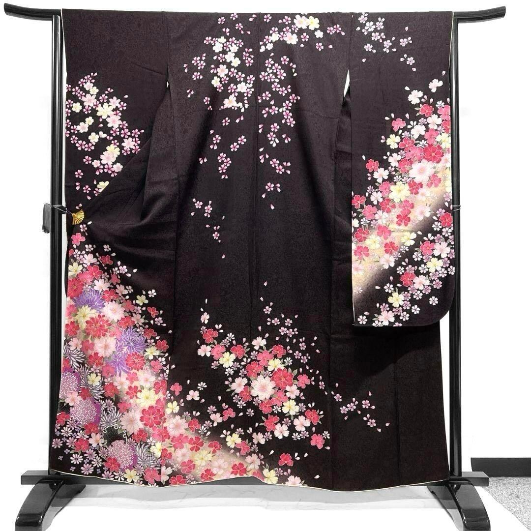 ダークトーンに銀彩があしらわれた乱菊や桜花模様が美しく描かれた一着です。