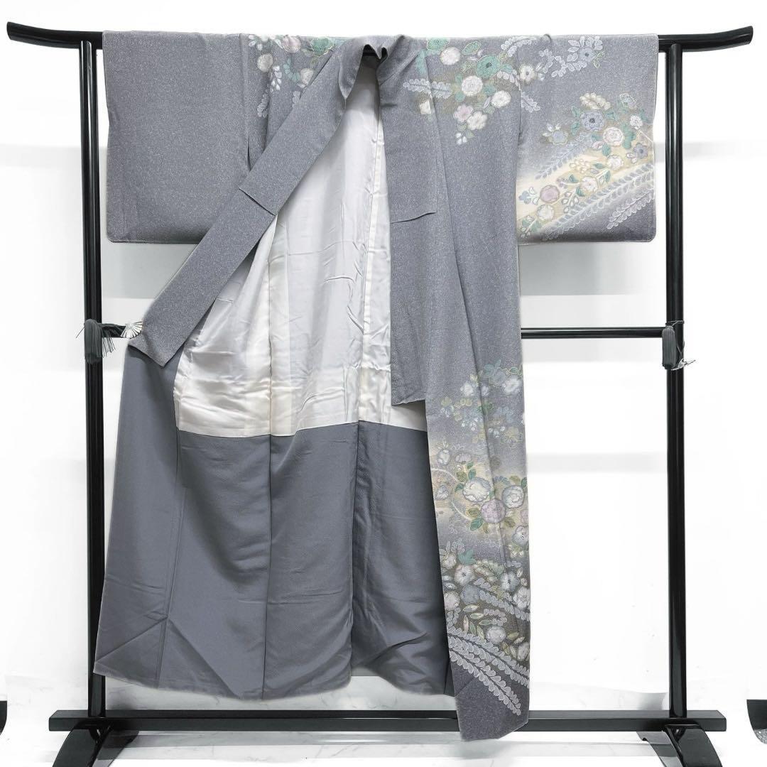 グレーのたたき染の地に映える金彩を交えて描かれた辻ヶ花の文様に藤や桜、リーフの文様が華やかなデザインの一着です。