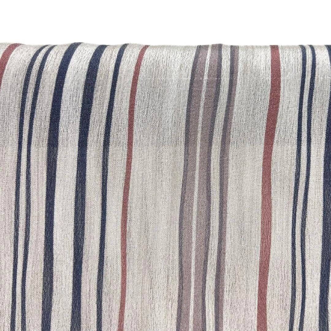 しゃりしゃりとした生地感の薄いベージュの紗の地によろけで描かれた様々な縦縞の文様がお洒落なデザインの一着です。