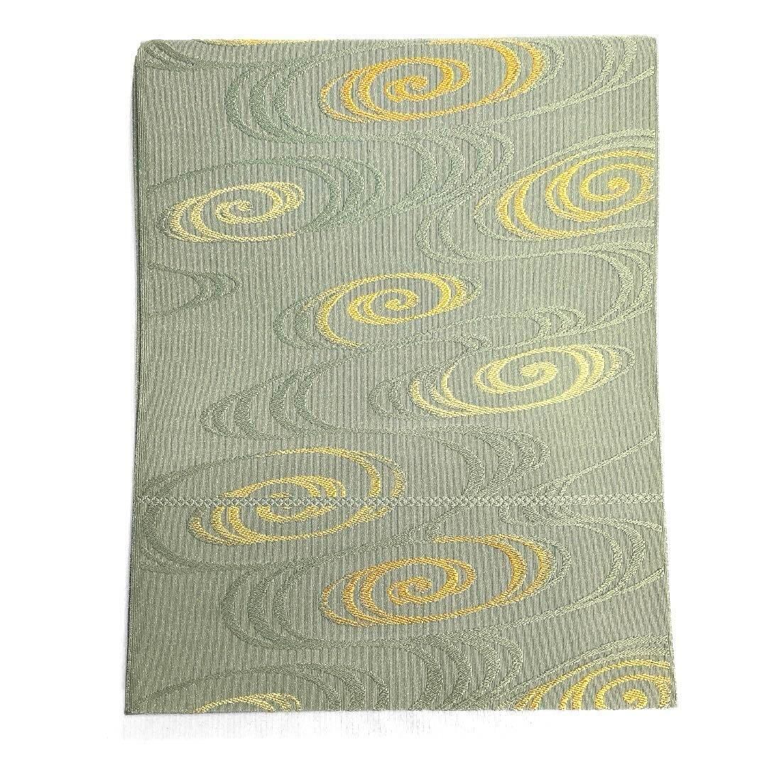 薄いくすみグリーンの綴れ織の地に金糸を交えて織られた観世水の文様がお洒落なデザインの一着です。