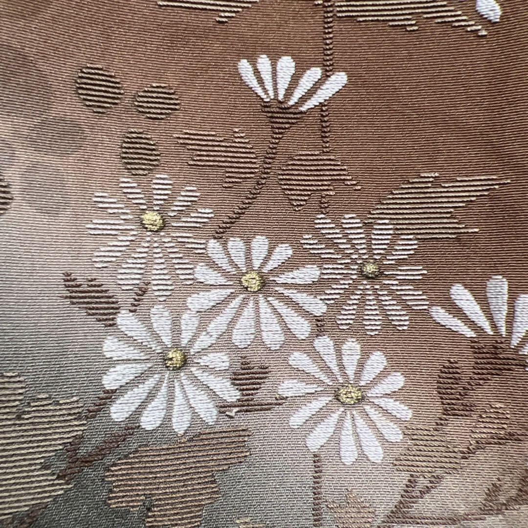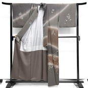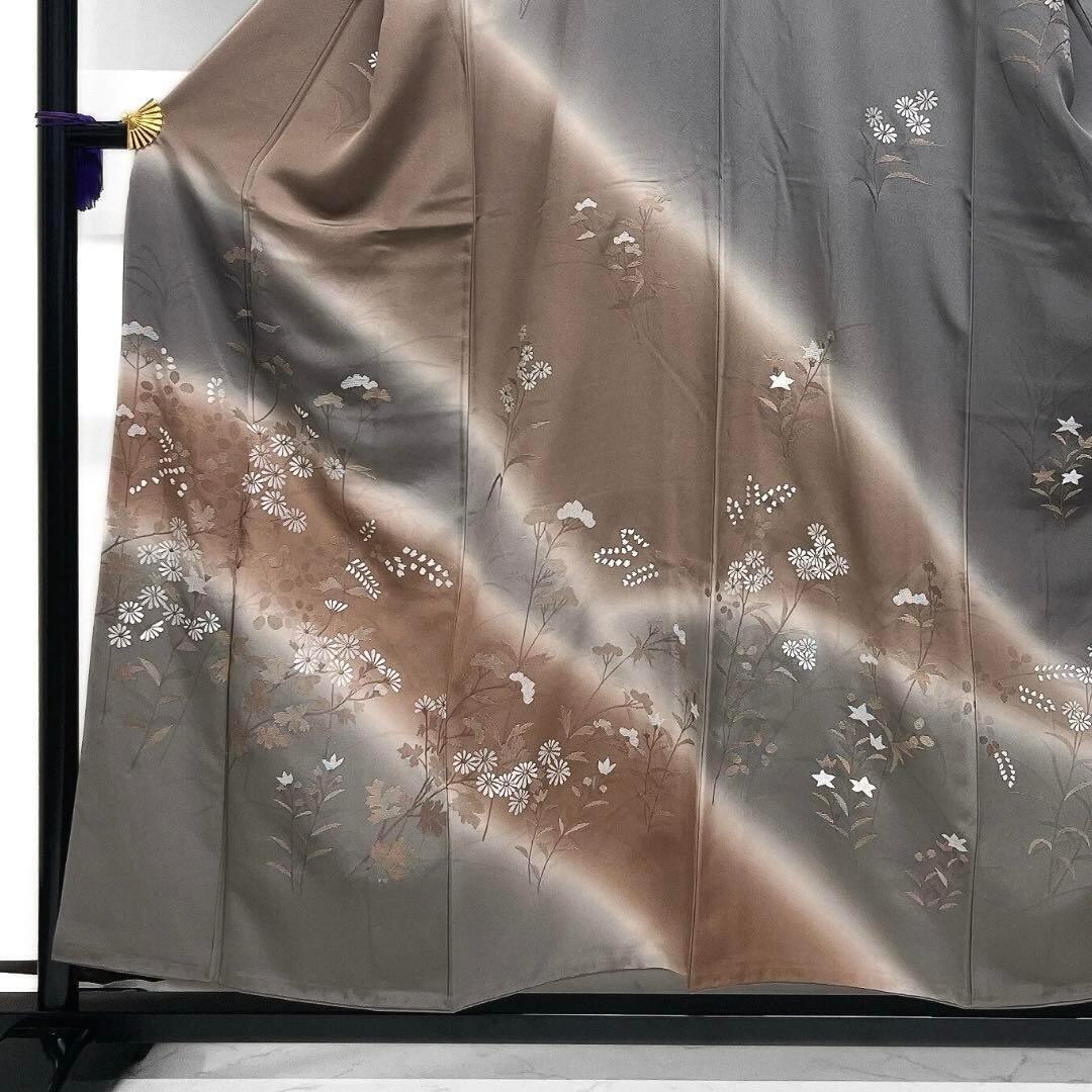 グレーとブラウンのぼかし染めに刺繍の花模様が全体に織られた華やかなデザインの一着です。