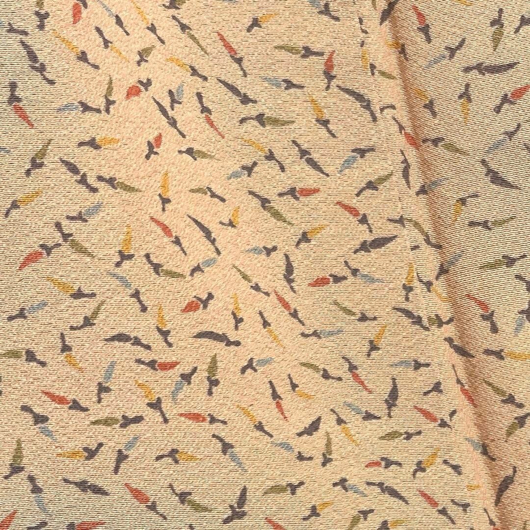 薄いブラウンの地にカラフルに描かれた唐辛子の文様が可愛らしいお洒落なデザインの一着です。