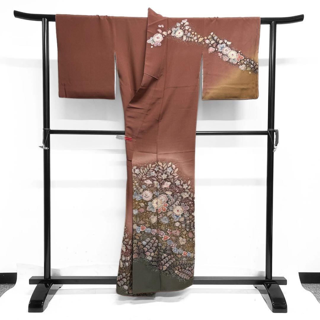 ブラウンの地に映える絞りで描かれた辻ヶ花の文様にリーフや藤、椿、葵の文様が華やかなデザインの一着です。