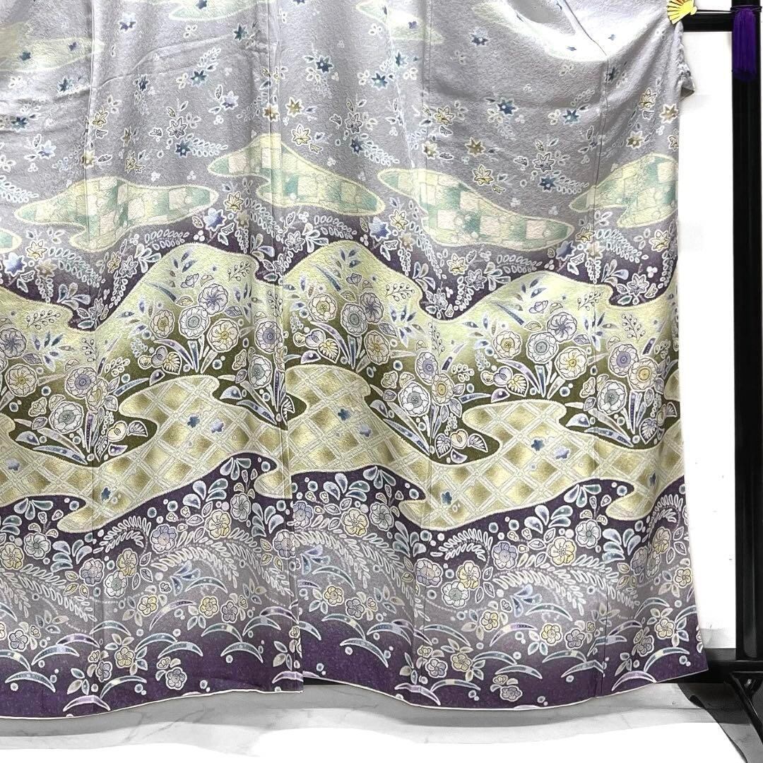 薄いグレーの地に辻ヶ花の文様と雲に藤と菱や松皮菱、色紙の文様が描かれた華やかなデザインのお洒落な一着です。