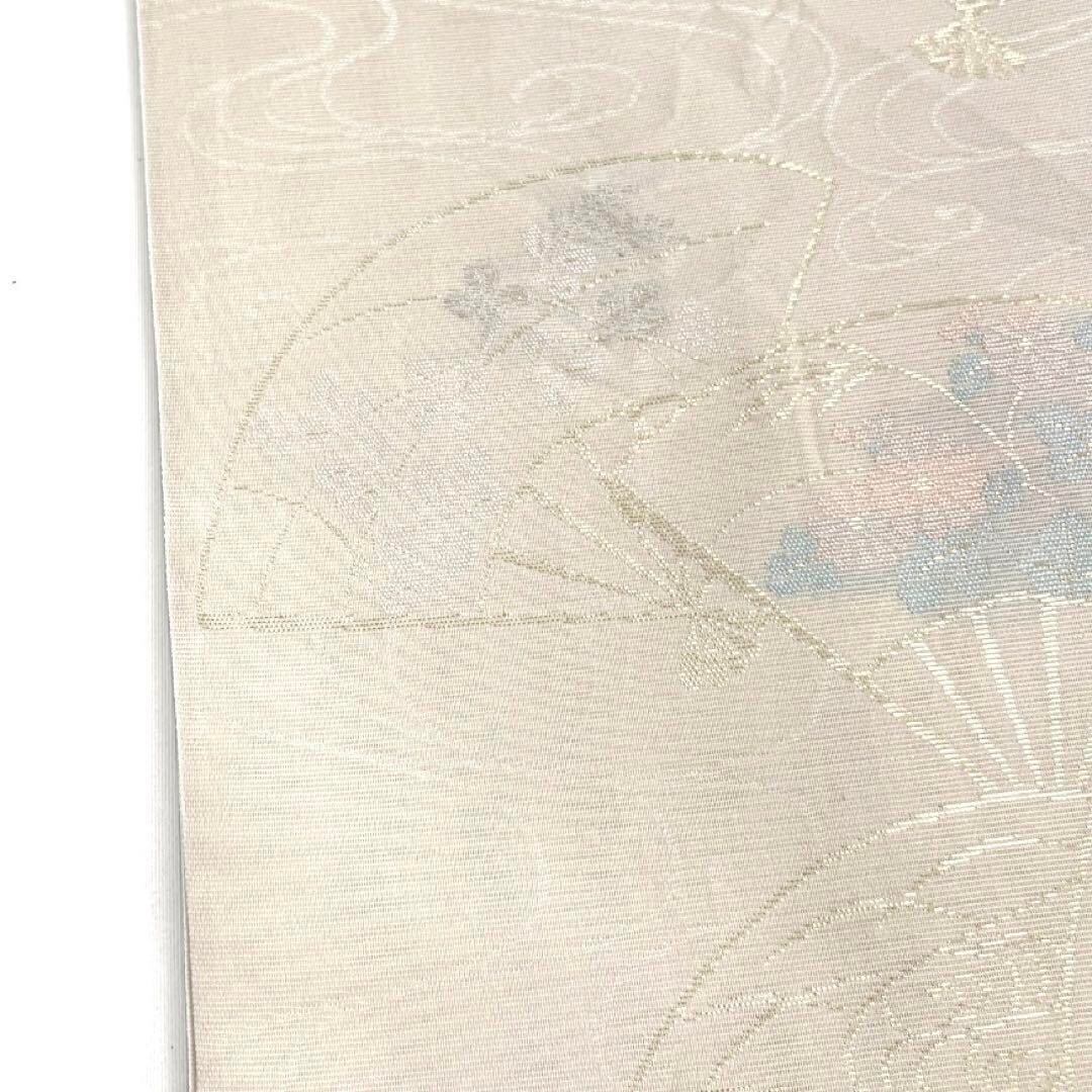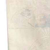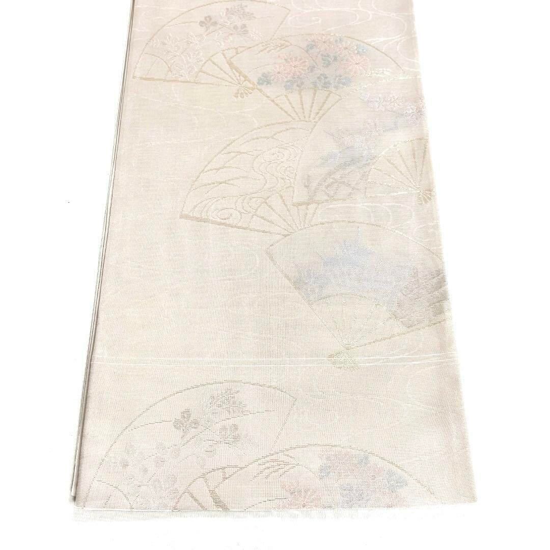 オフホワイトの紗の地に扇に淡い菊や楓、菖蒲、萩に観世水が織られた涼やかでお洒落なデザインの一着です。