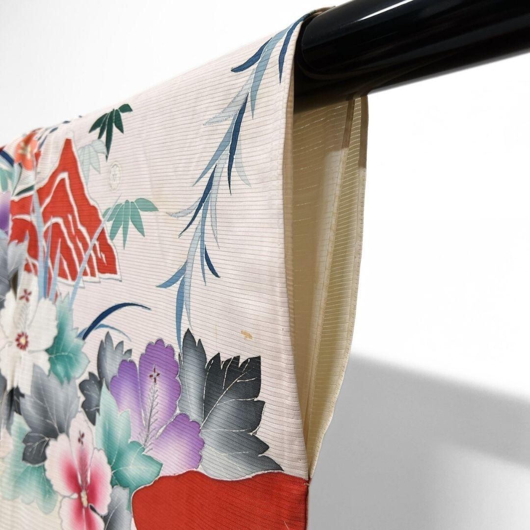 芙蓉や萩、松竹梅が鮮やかなお色味と繊細なグラデーションで美しく描かれた一着です。