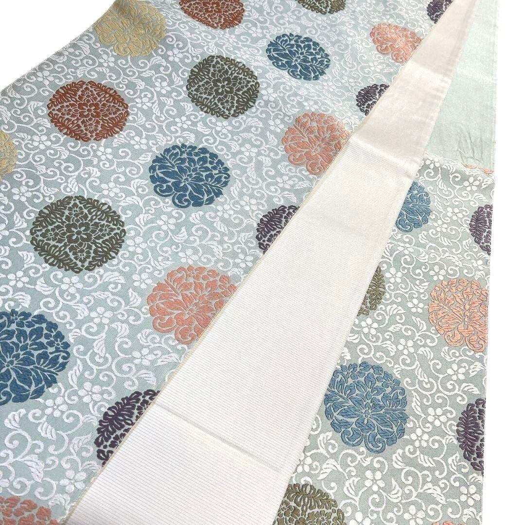 唐織で唐花模様や花紋、菖蒲紋が織り出された袋帯です。