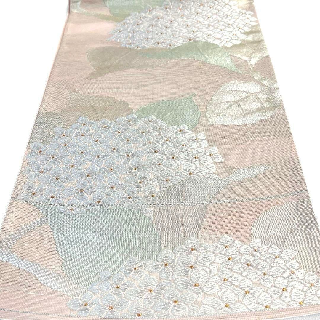 淡いピンク地に白の美しい紫陽花模様が織り出された1着です。