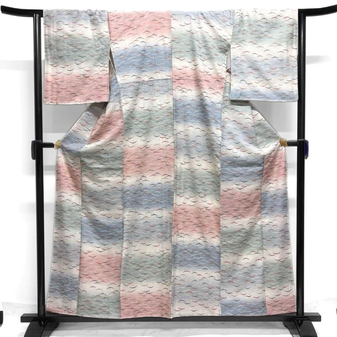 ホワイトとくすみのあるパステルカラーの地に金彩と芝草と露芝が描かれたお洒落なデザインの一着です。