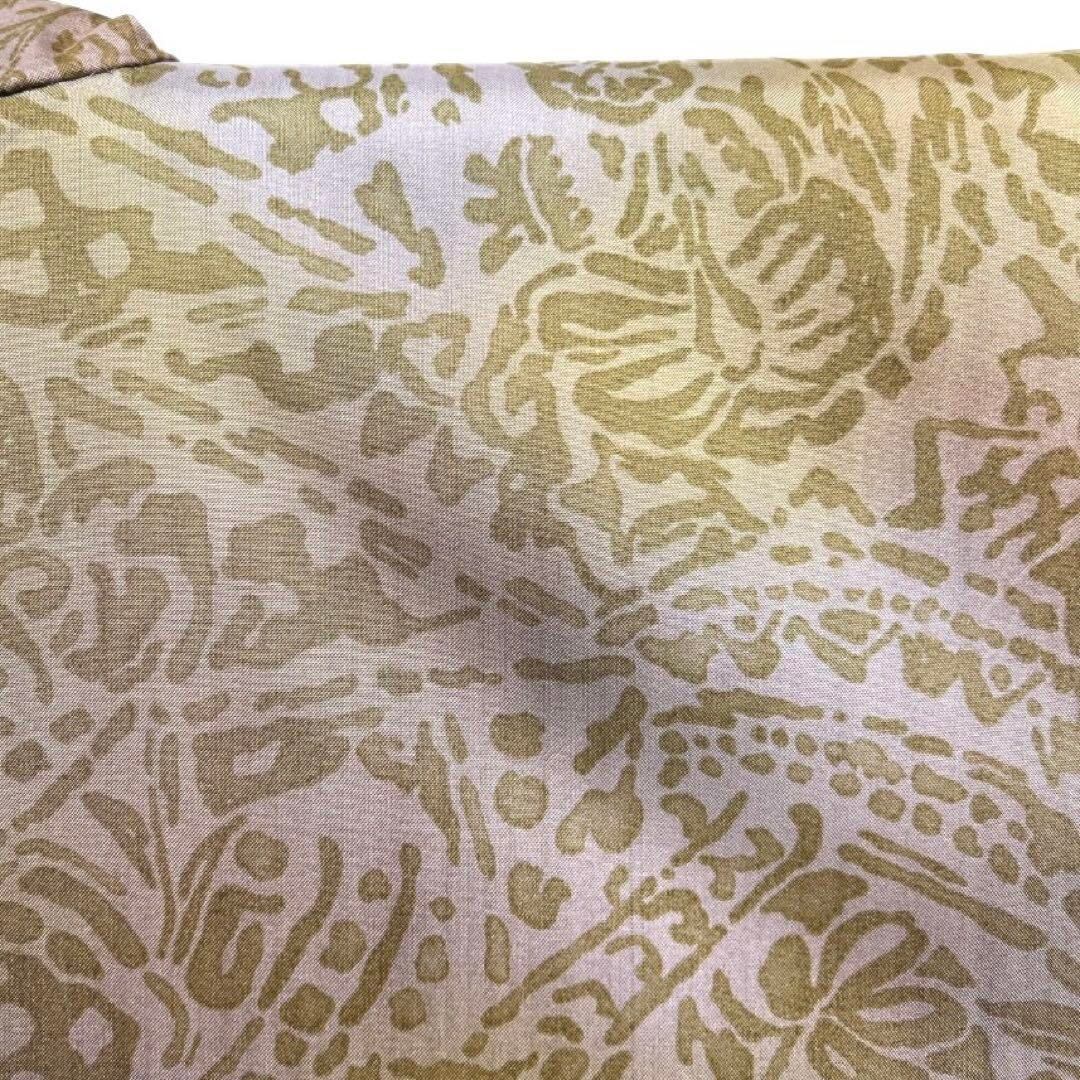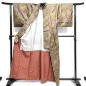 染大島紬のグラデーションの地に描かれた抽象模様と唐花の文様が目を惹くお洒落なデザインの一着です。