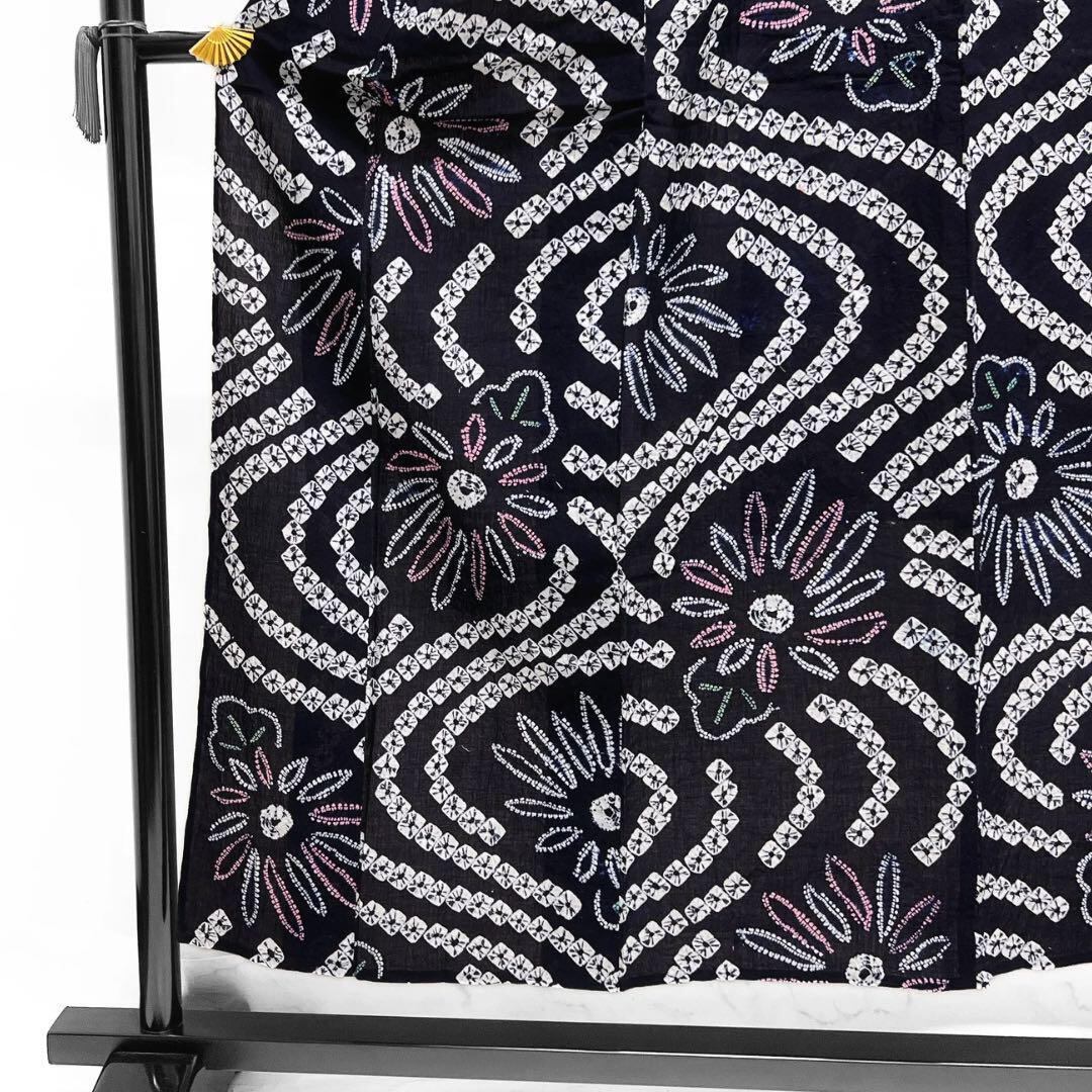 黒に近い深いネイビーの藍染の地に絞りで描かれた鹿の子による流水に菊花の文様がお洒落なデザインの一着です。