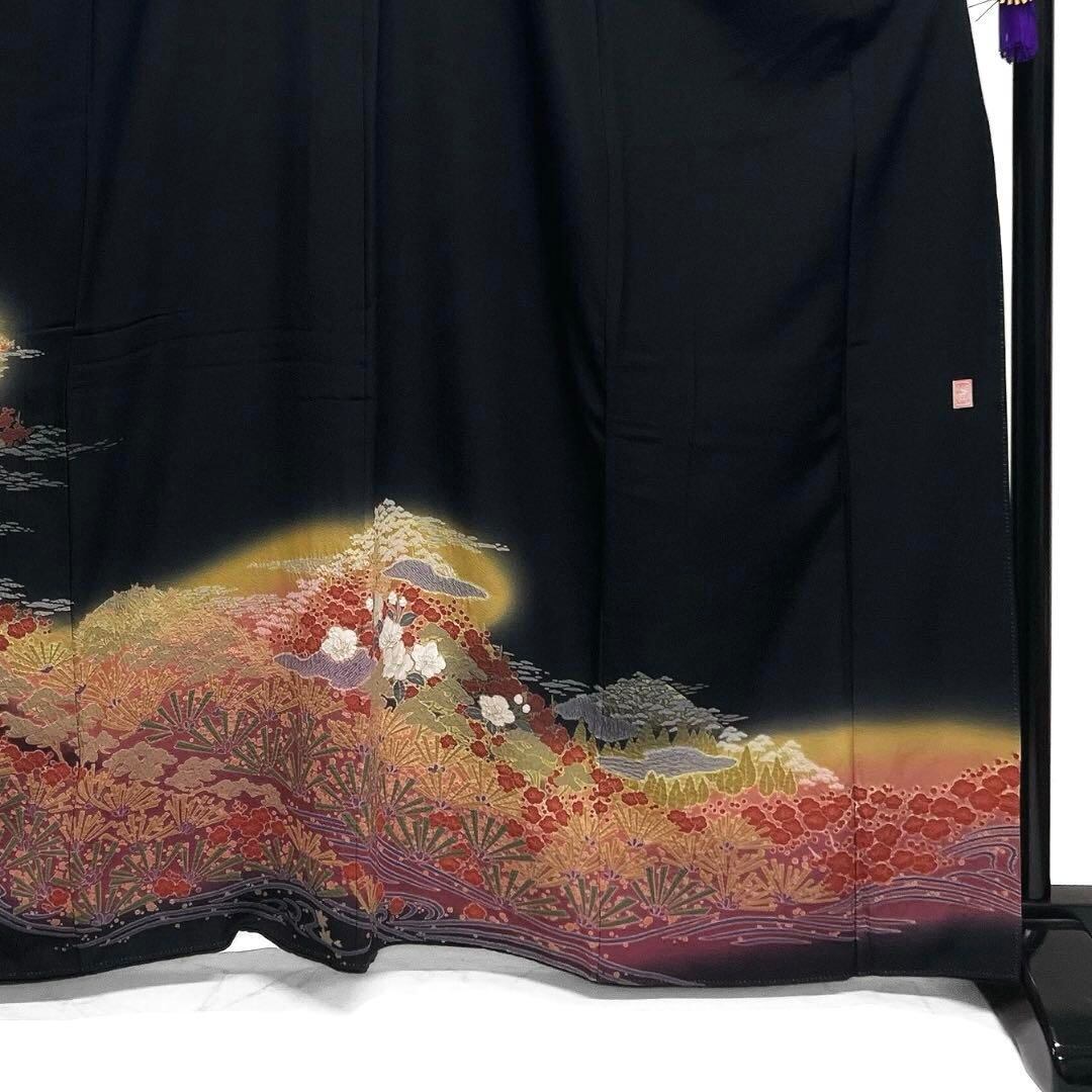 黒地に映える絞りと刺繍、金駒刺繍で桜に松と梅、流水に楓の文様が絢爛で華やかなデザインの一着です。