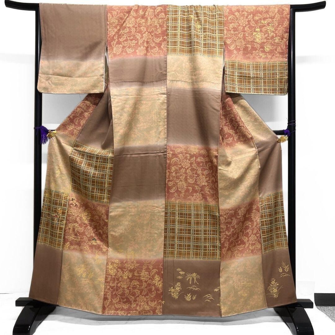 松や菊花、萩がデザインされ、全体の大柄な市松模様が美しい一着です。