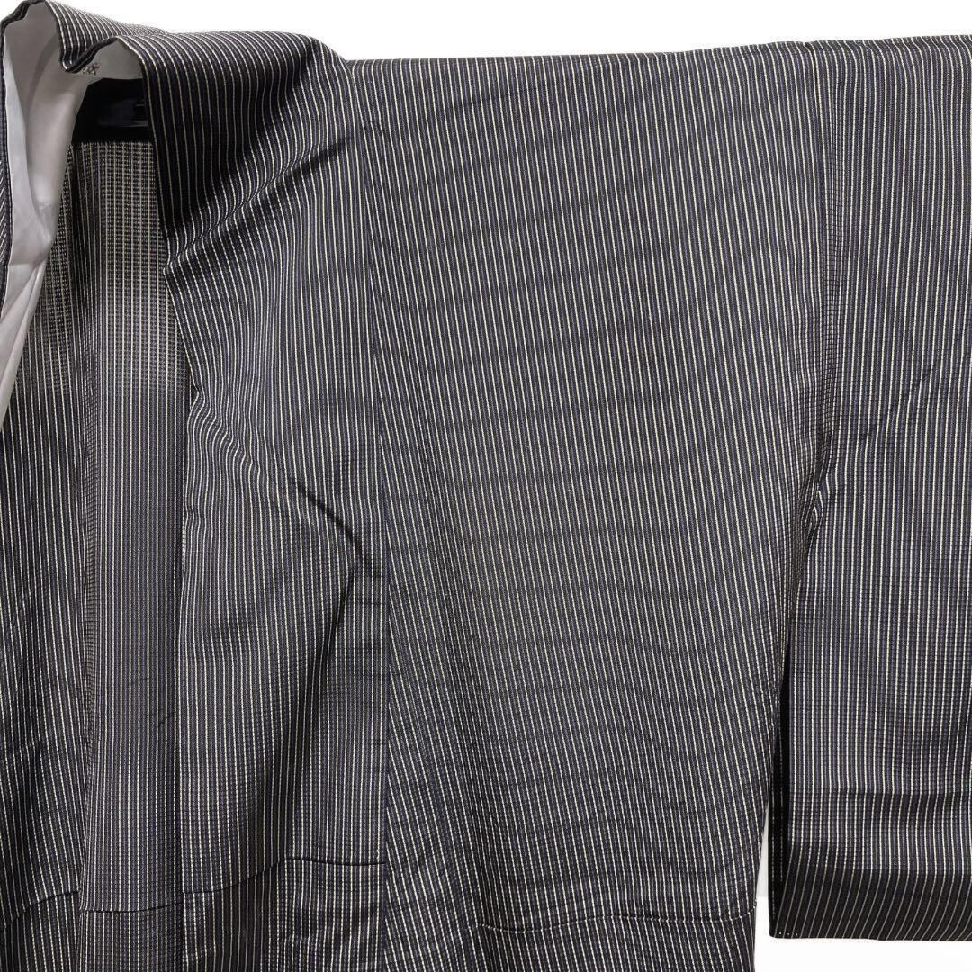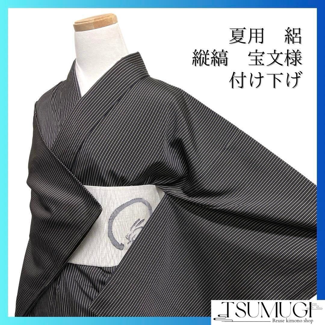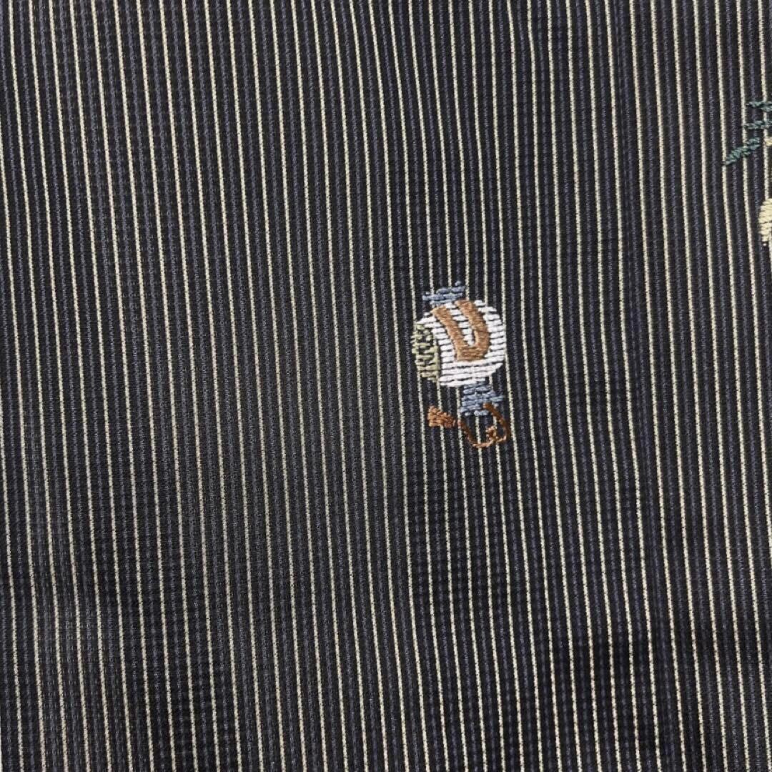 黒の絽の地にパープルとアイボリーの縦縞に刺繍で織られた打ち出の小槌や鈴、大判、竹にひょっとこやおかめ、翁の面などが可愛らしいお洒落なデザインの一着です。