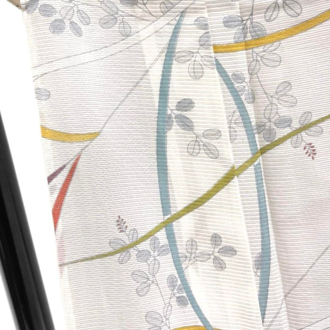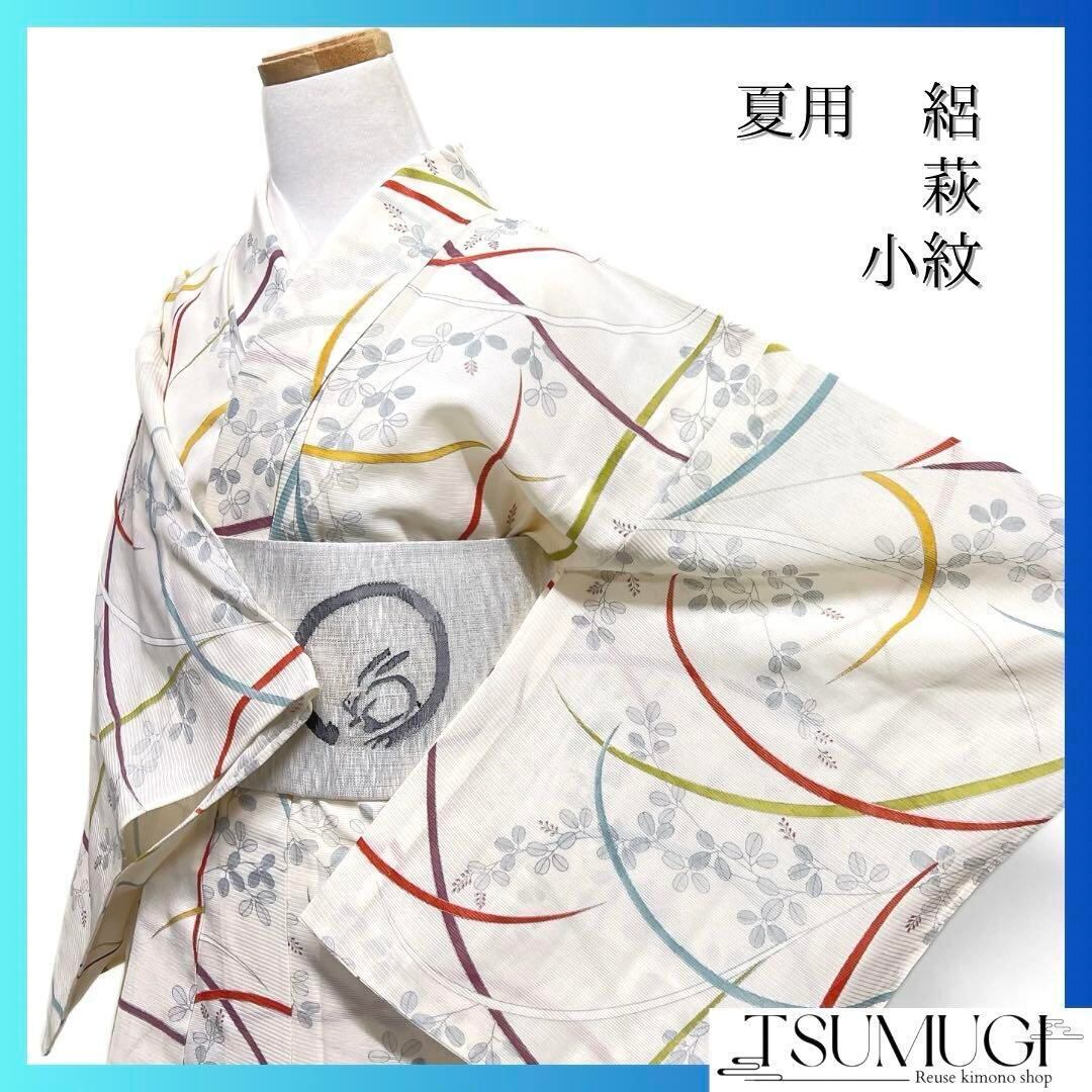 オフホワイトの絽の地に描かれた萩の文様とカラフルなリーフの文様がお洒落なデザインの一着です。