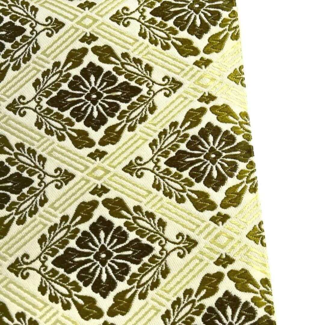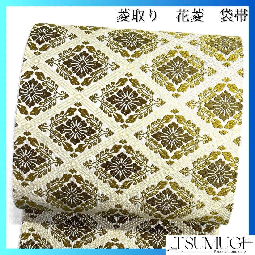 白地にくすみカラーの花菱文様が織られた華やかなデザインの一着です。
