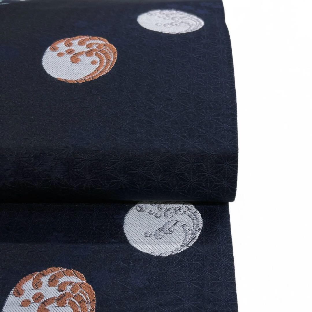 深いネイビーの麻の葉と楓の地に波紋が織られたお洒落なデザインの一着です。