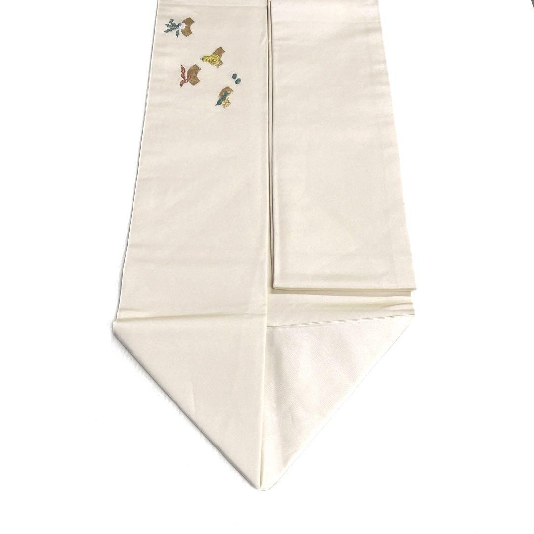 アイボリーの塩瀬の地に金の扇文様と様々な野菜の文様が織られた可愛らしいお洒落なデザインの一着です。