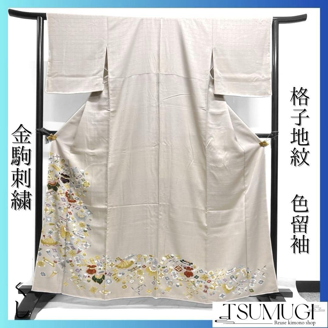 存在感のある格子地紋に肌馴染みがよく上品で洗練されたイメージのベージュカラーのお色味の一着です。