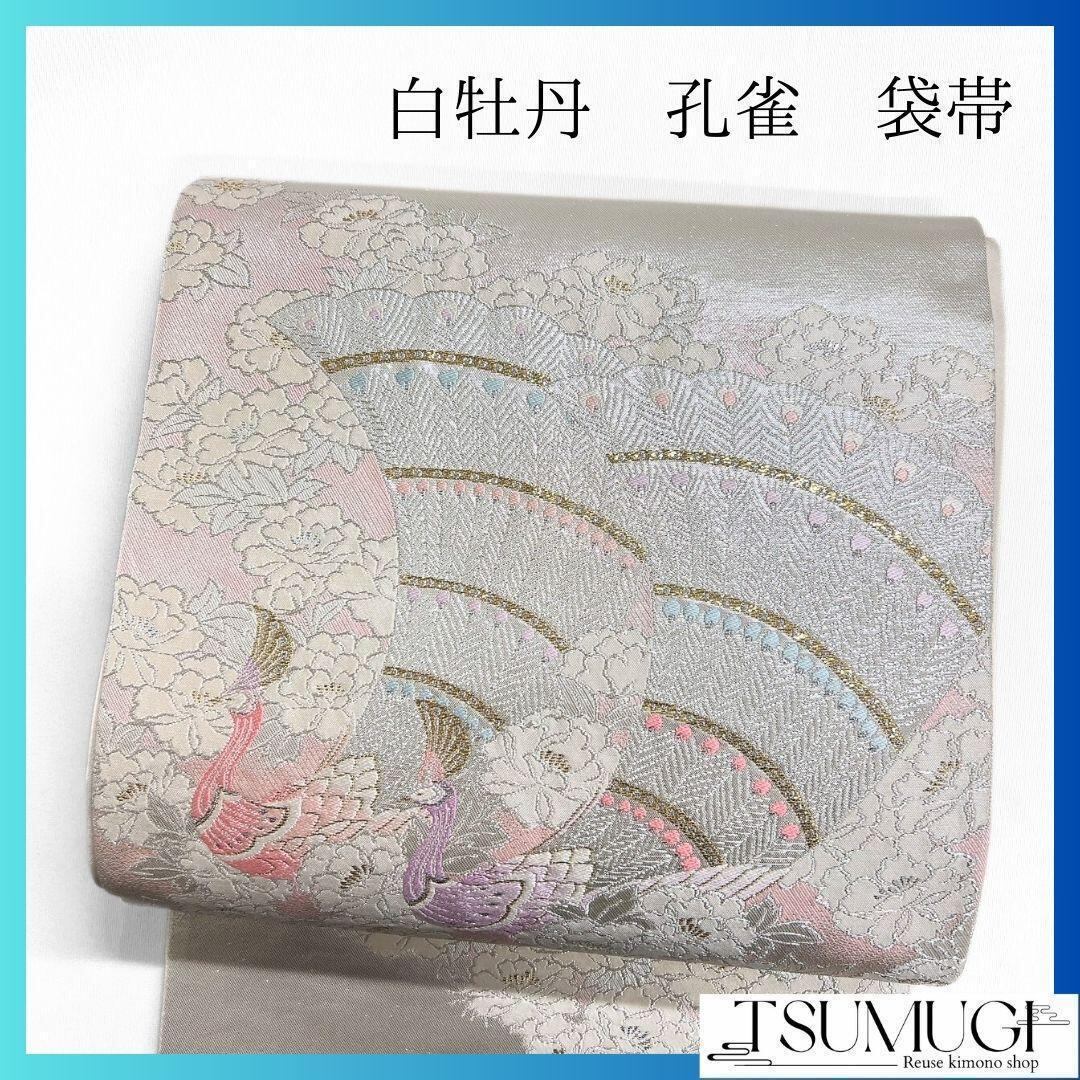 銀地に孔雀模様、牡丹が織り出された袋帯です。