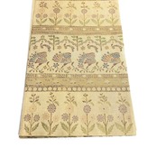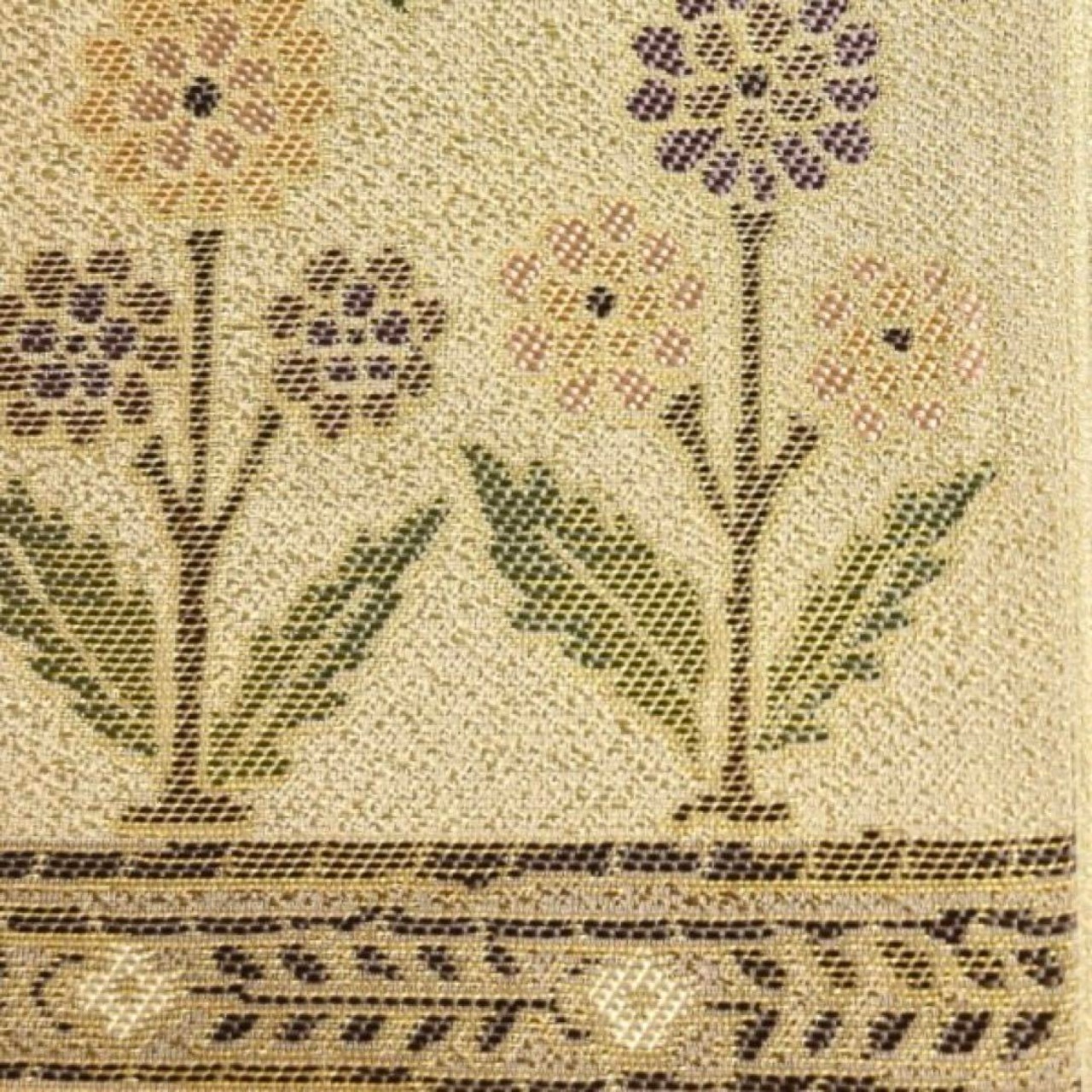 ベージュ地に横縞と唐花に花模様と鳥の文様がお洒落なデザインの一着です。