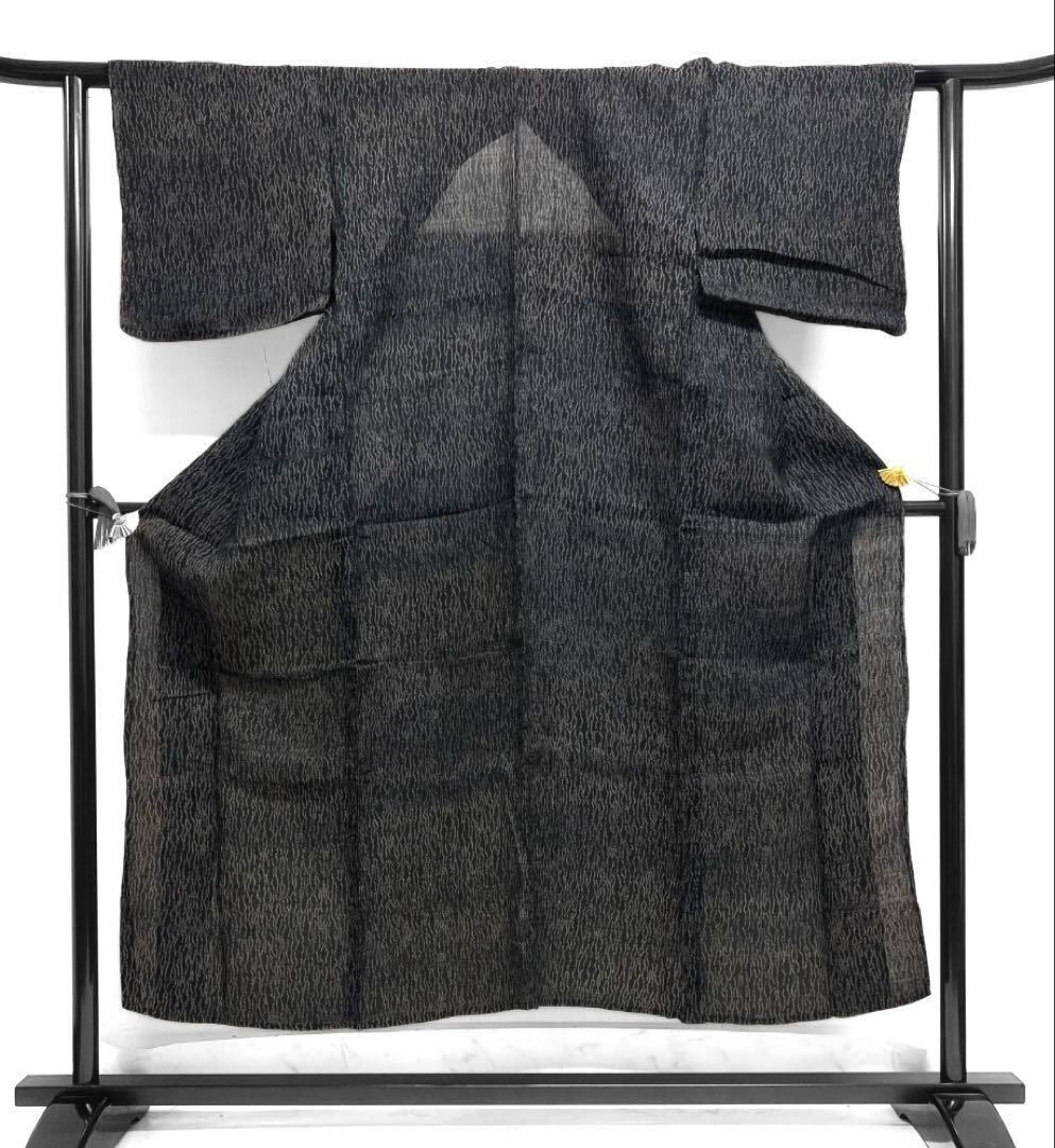 サマーウールの黒地にくすみベージュのよろけ縦縞の文様が織られたお洒落なデザインの一着です。