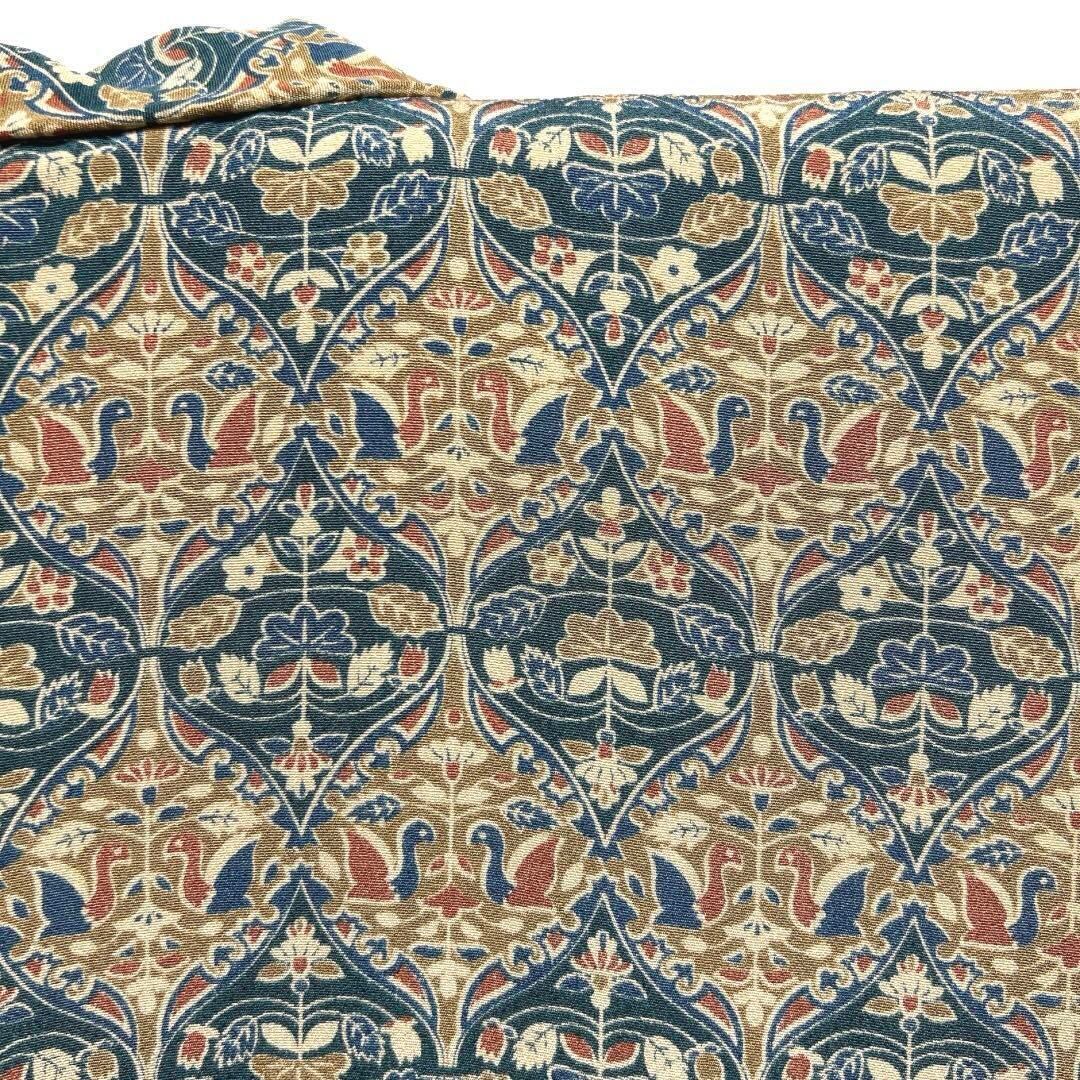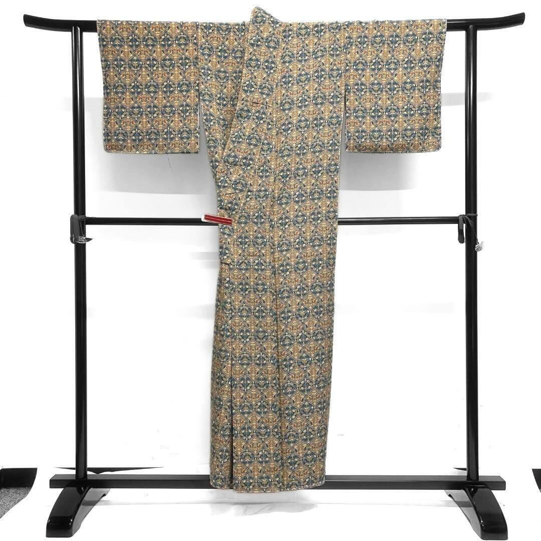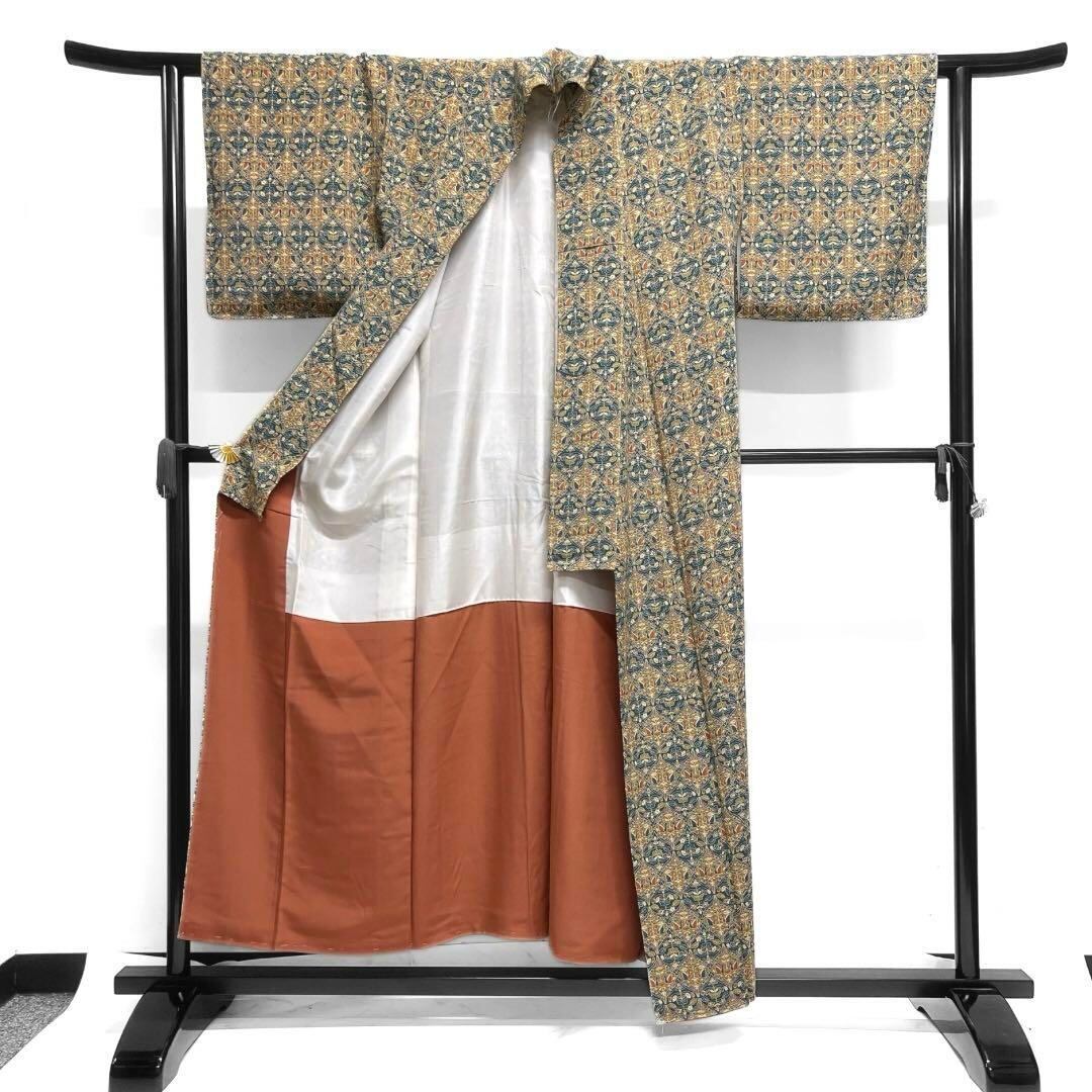 ちりめんの地にくすみイエローと深いくすみエメラルドグリーンの立涌に唐花と千鳥の更紗文様が描かれたお洒落なデザインの一着です。