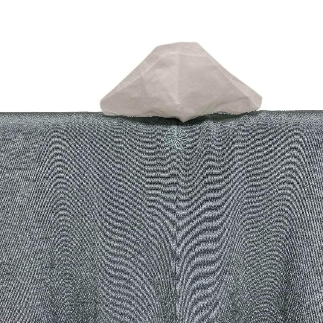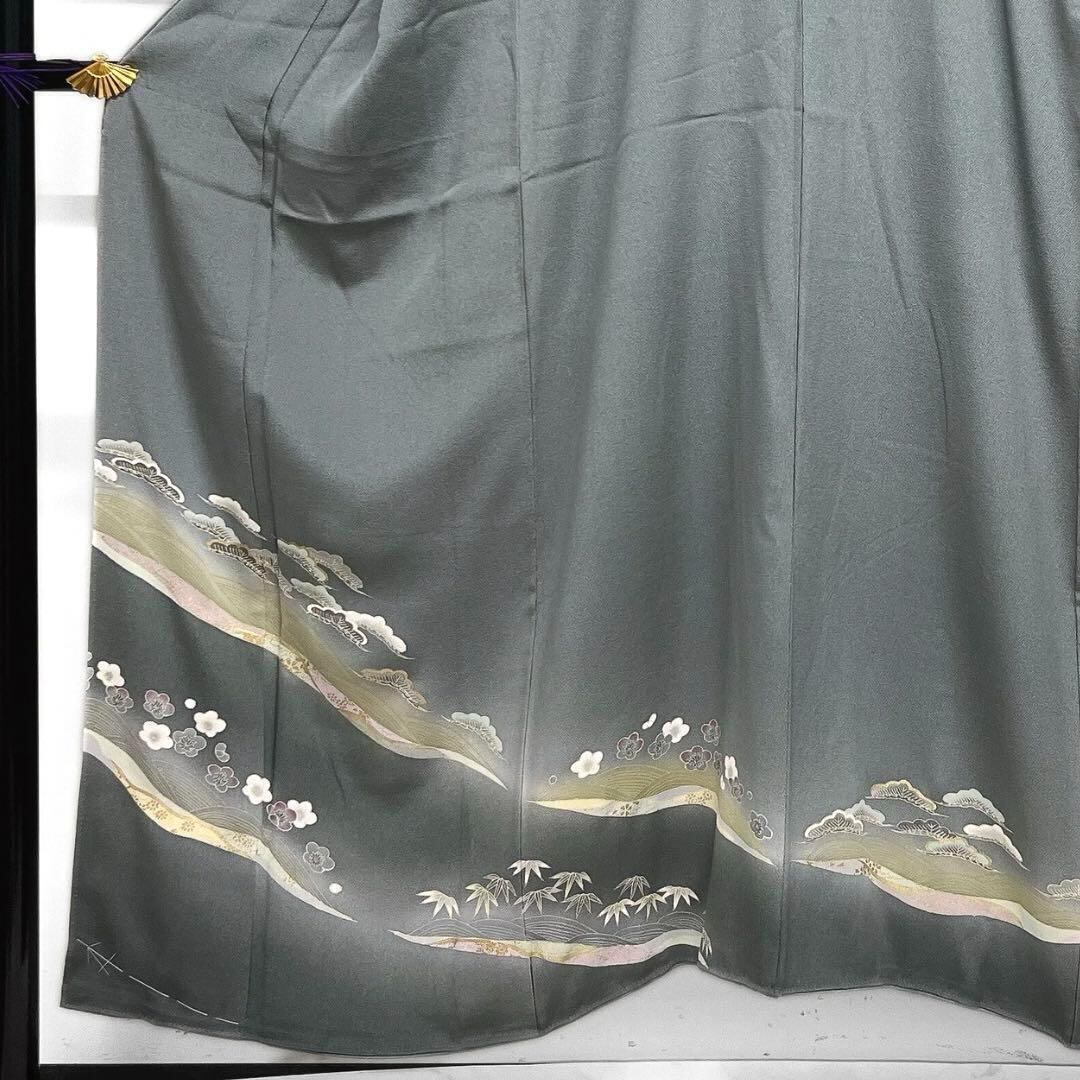 グリーンのかかったグレー地に松竹梅が描かれた華やかなデザインの一着です。