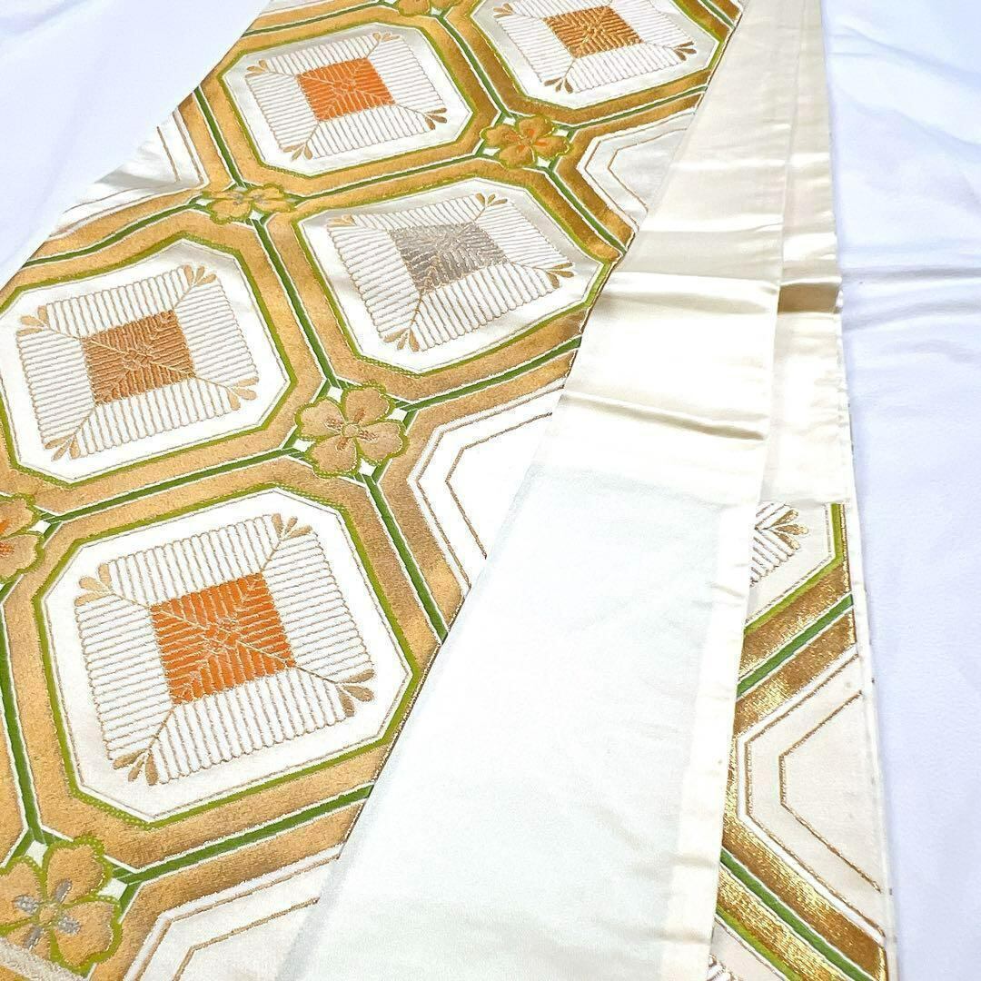 白地に金と緑の蜀江紋にオレンジや銀の松と花模様が華やかな一着です。