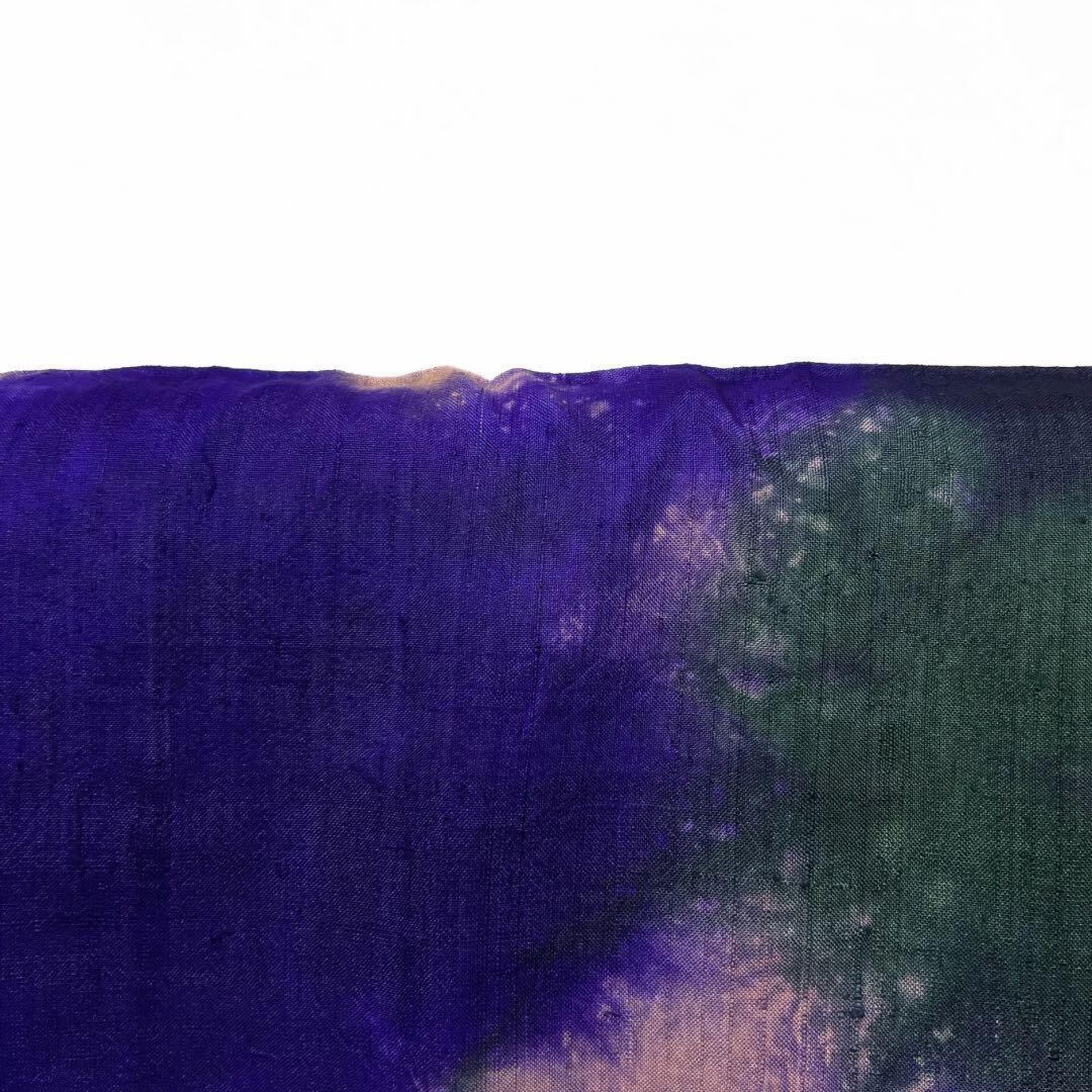 紬地にグリーン、パープル、ピンクの抽象模様が描かれたお洒落なデザインの一着です。
