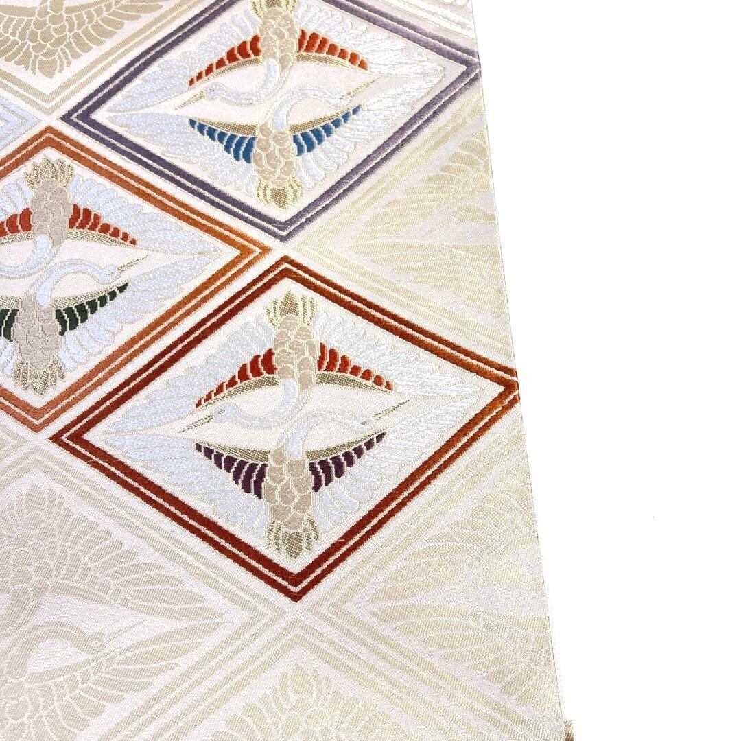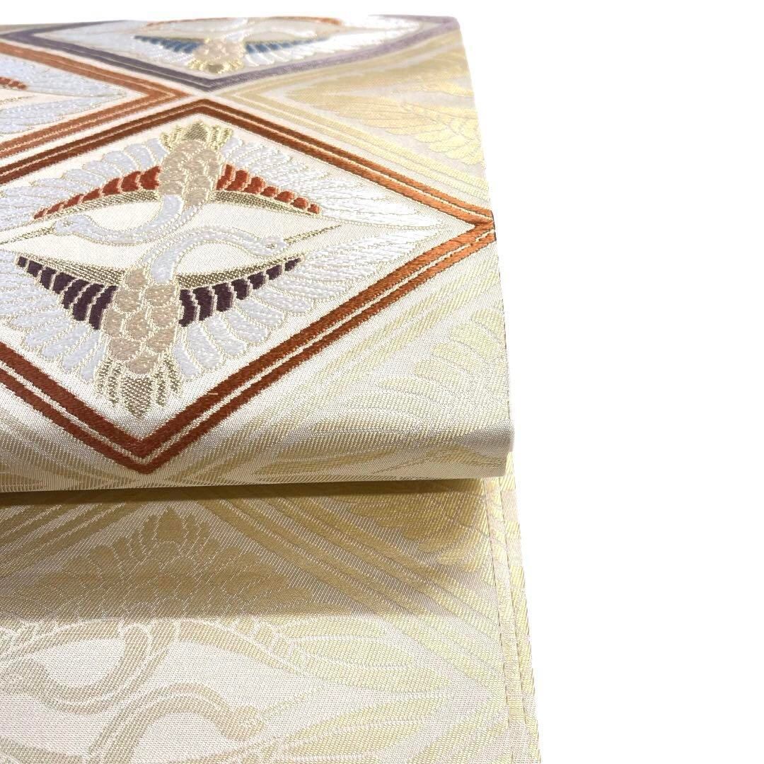 アイボリーの地に金とパープル、オレンジの菱に鶴菱の文様が織られた華やかなデザインの一着です。