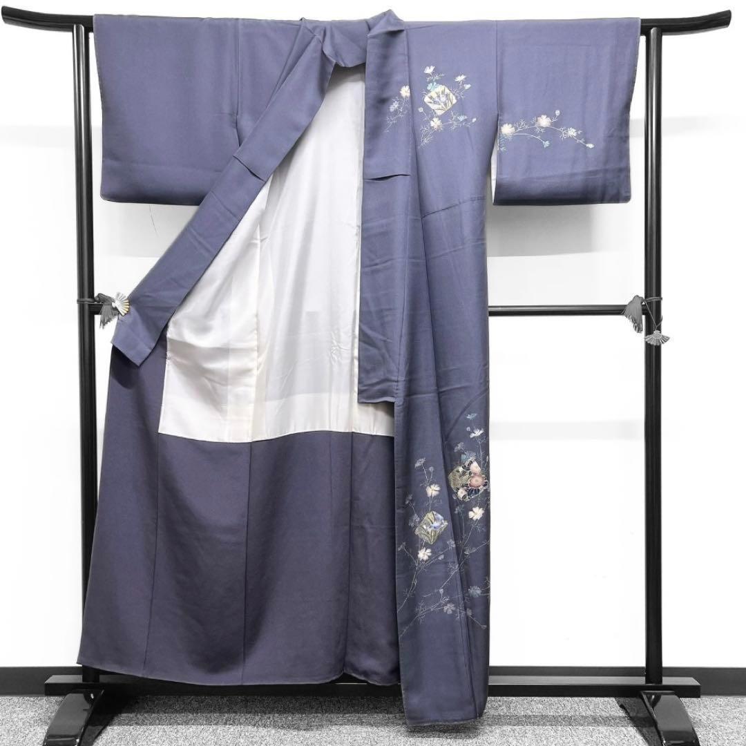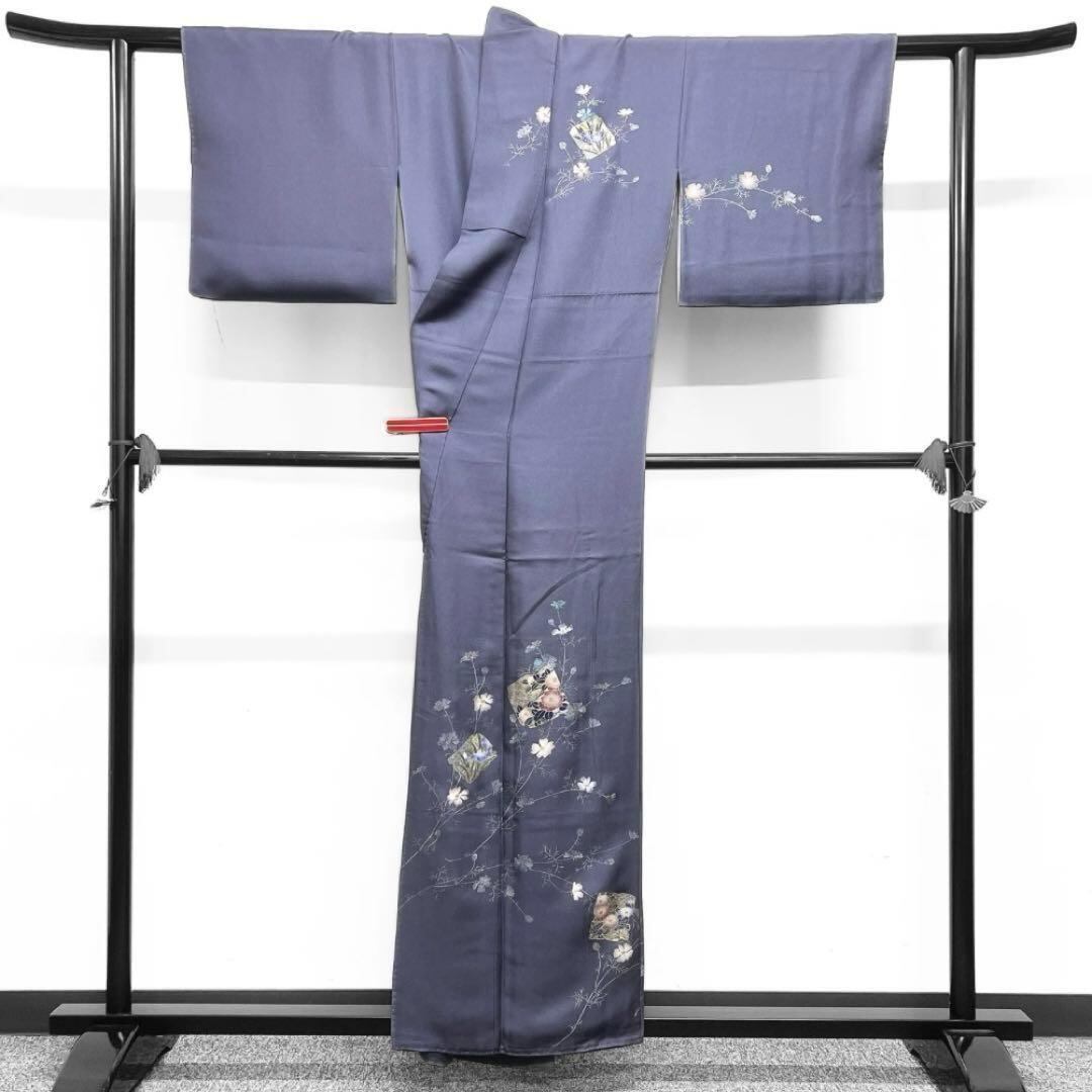 くすんだ薄い藍色地に彩箔で描かれた色紙に菊や椿、菖蒲に撫子が描かれた華やかな一着です。