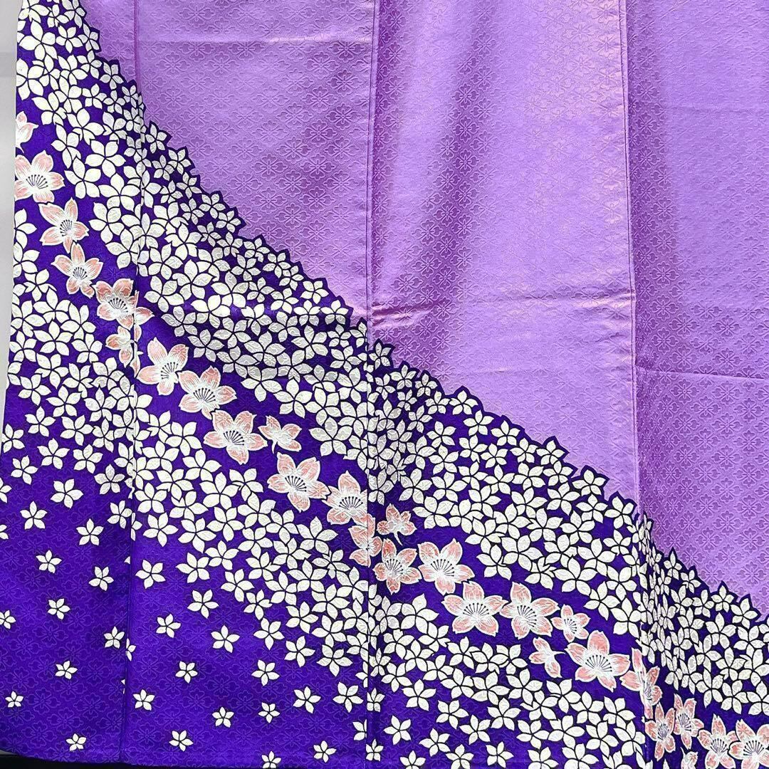 花菱地紋や淡く明るい紫地に桜の花びらが描かれた可愛らしいお洒落な一着です。